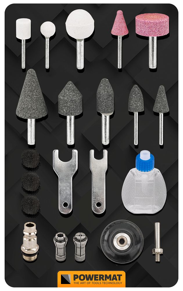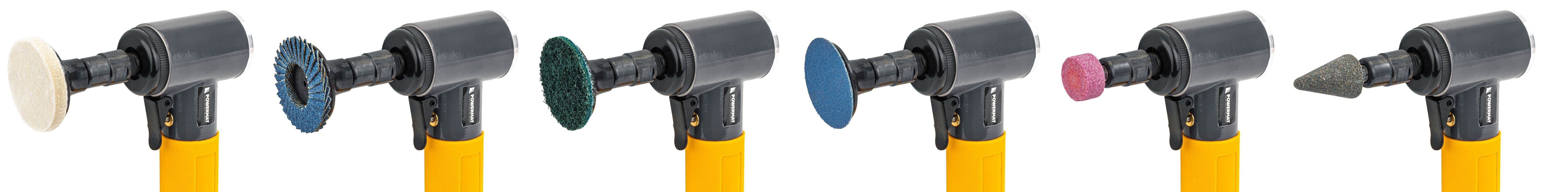Dołączone końcówki ścierne, tarcze, krążki i tulejki umożliwiają szeroki zakres zastosowań. Dzięki różnym materiałom i kształtom elementów roboczych możliwe jest przeprowadzenie pełnego procesu – od czyszczenia, przez szlifowanie, aż po polerowanie na wysoki połysk.