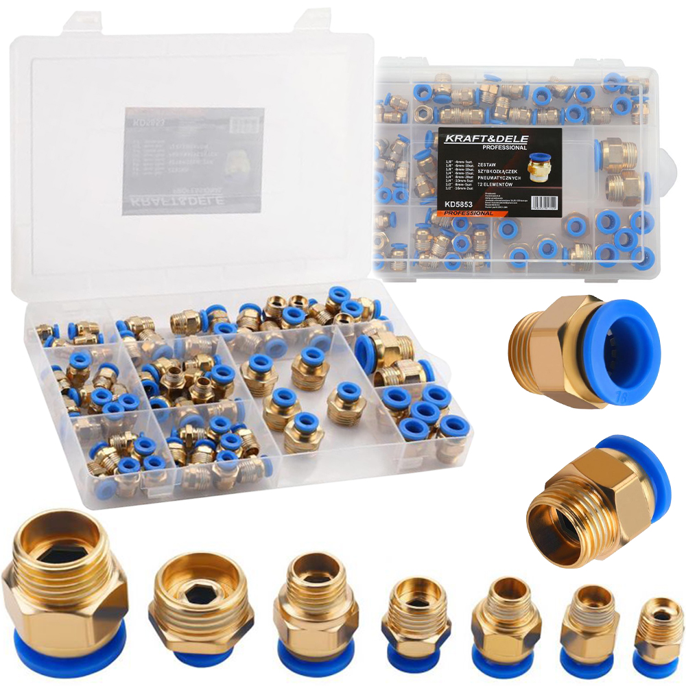 Profesjonalny zestaw szybkozłączy pneumatycznych to kompletny pakiet 72 elementów o różnych średnicach i gwintach, umożliwiający szybkie oraz szczelne łączenie elementów instalacji pneumatycznych. Dzięki szerokiemu zakresowi rozmiarów złączki sprawdzą się zarówno w warsztatach, zakładach produkcyjnych, jak i przy pracach serwisowych.