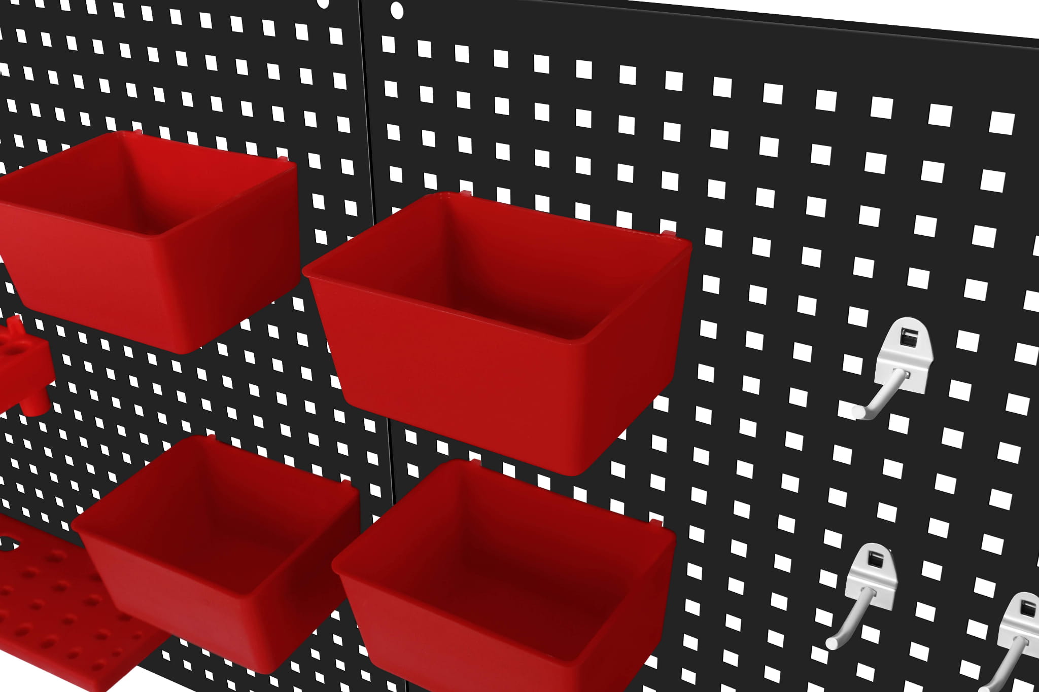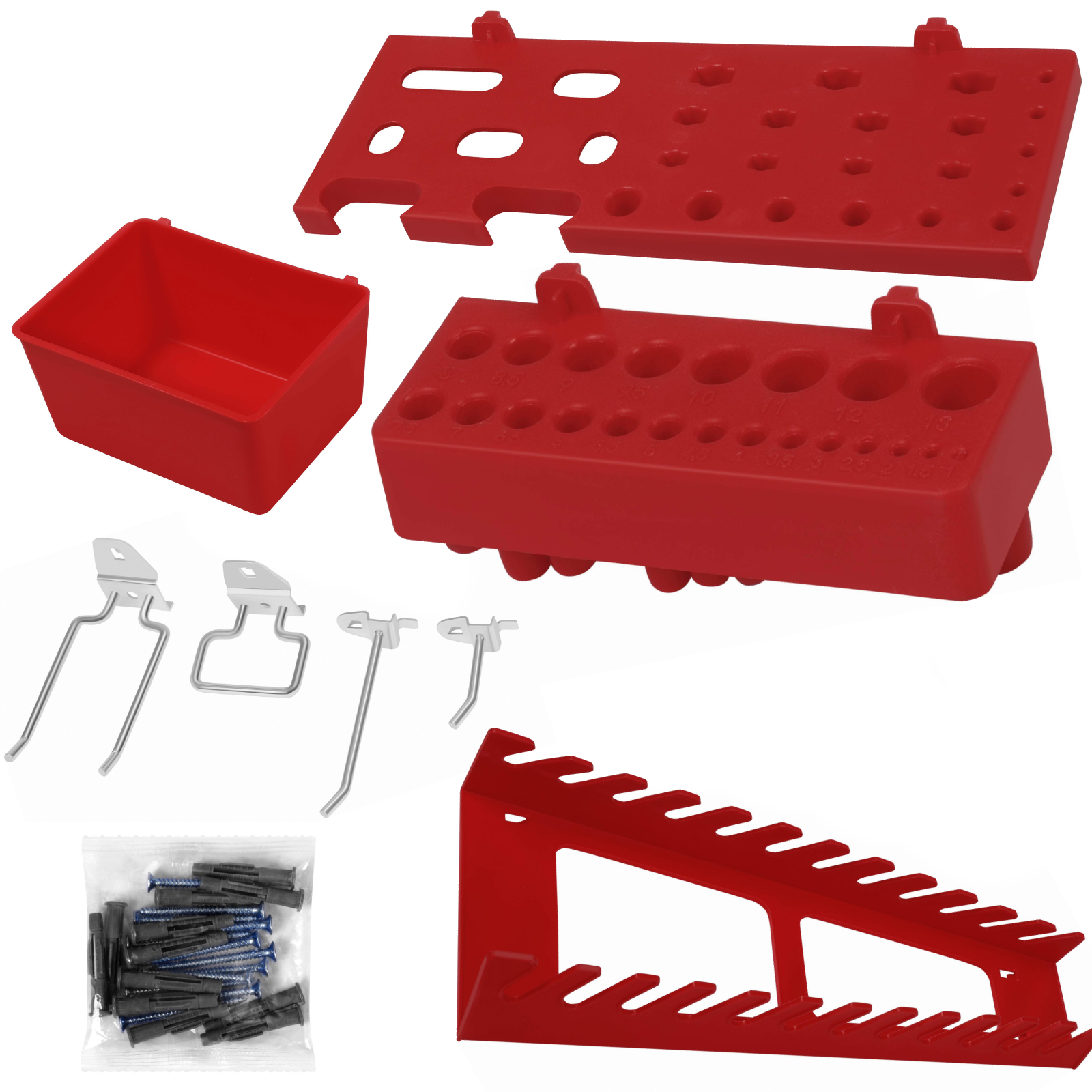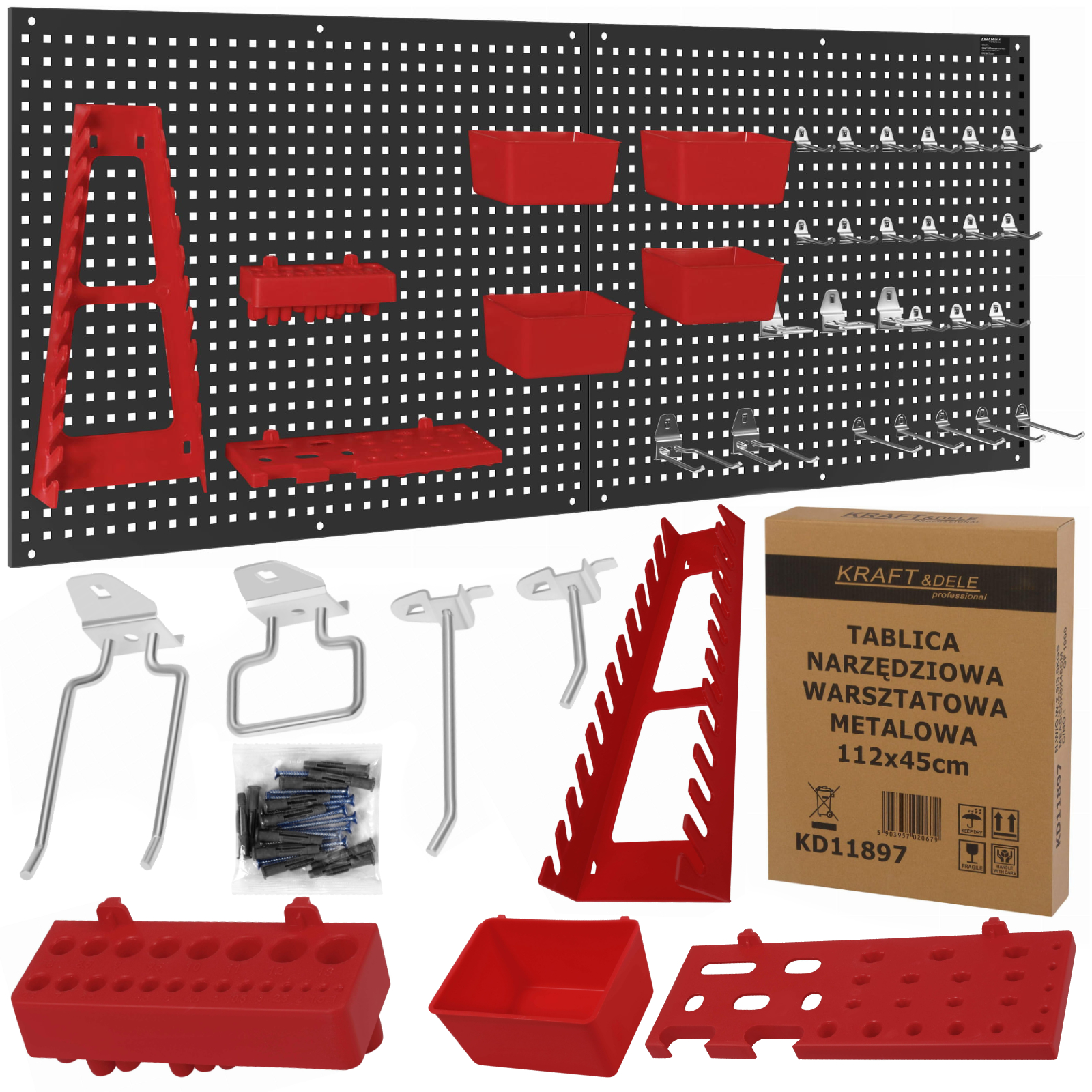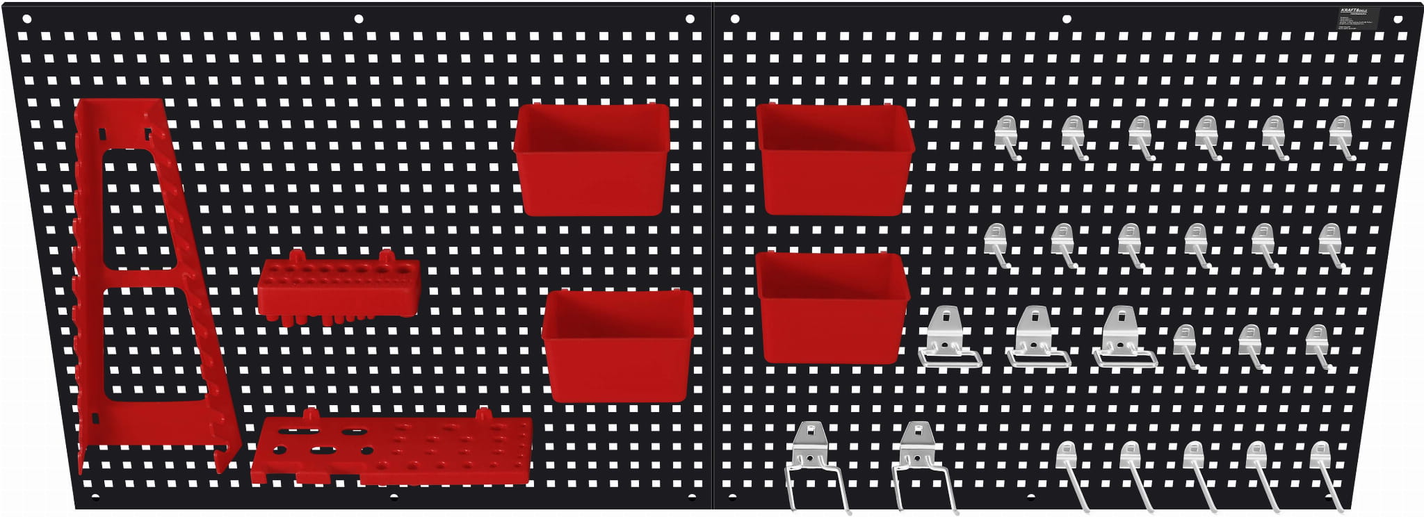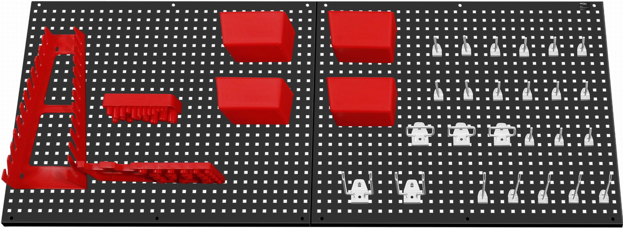 - rozbudowany zestaw akcesoriów – liczne haki, uchwyty i pojemniki pozwalają na uporządkowanie różnorodnych narzędzi