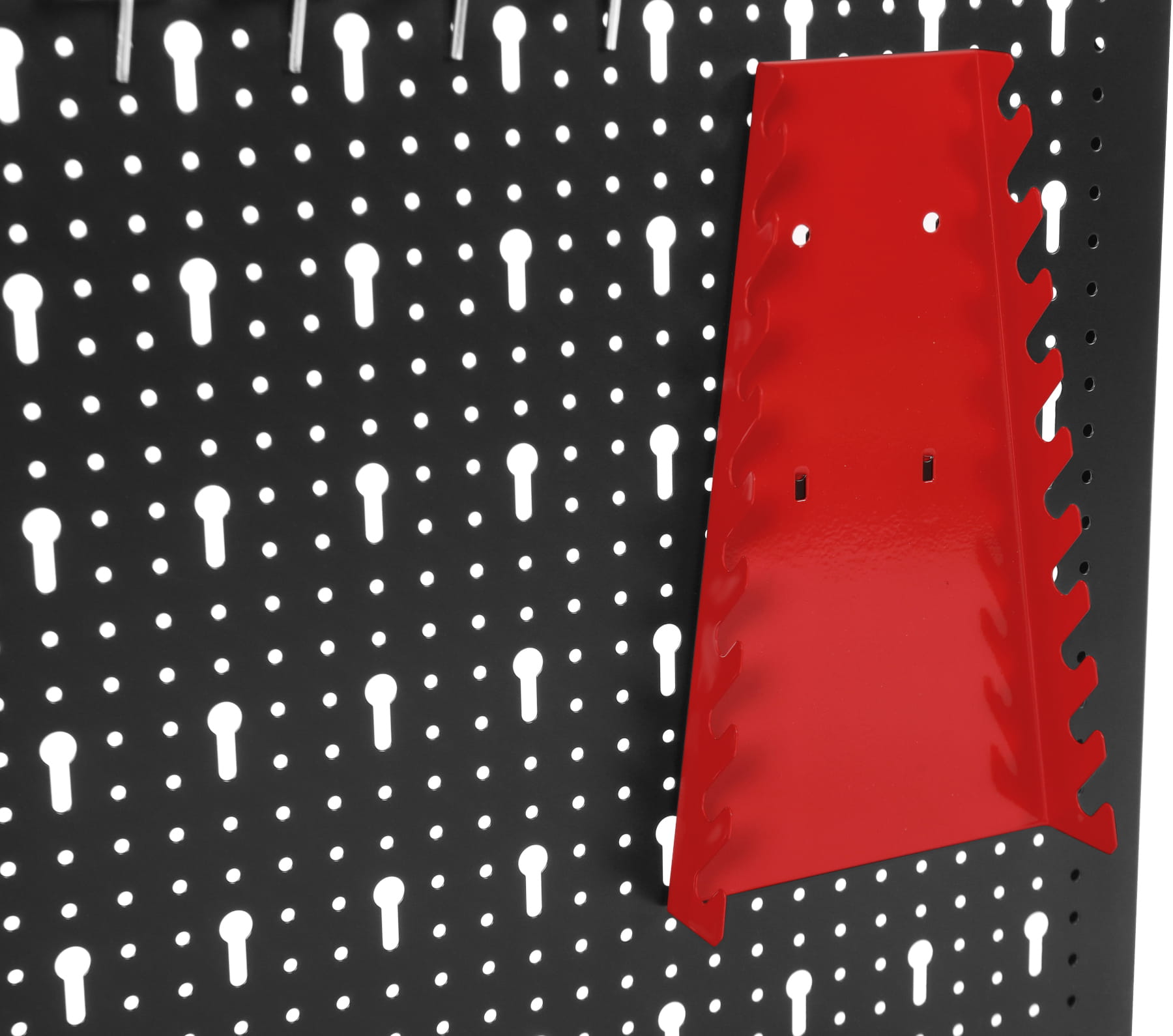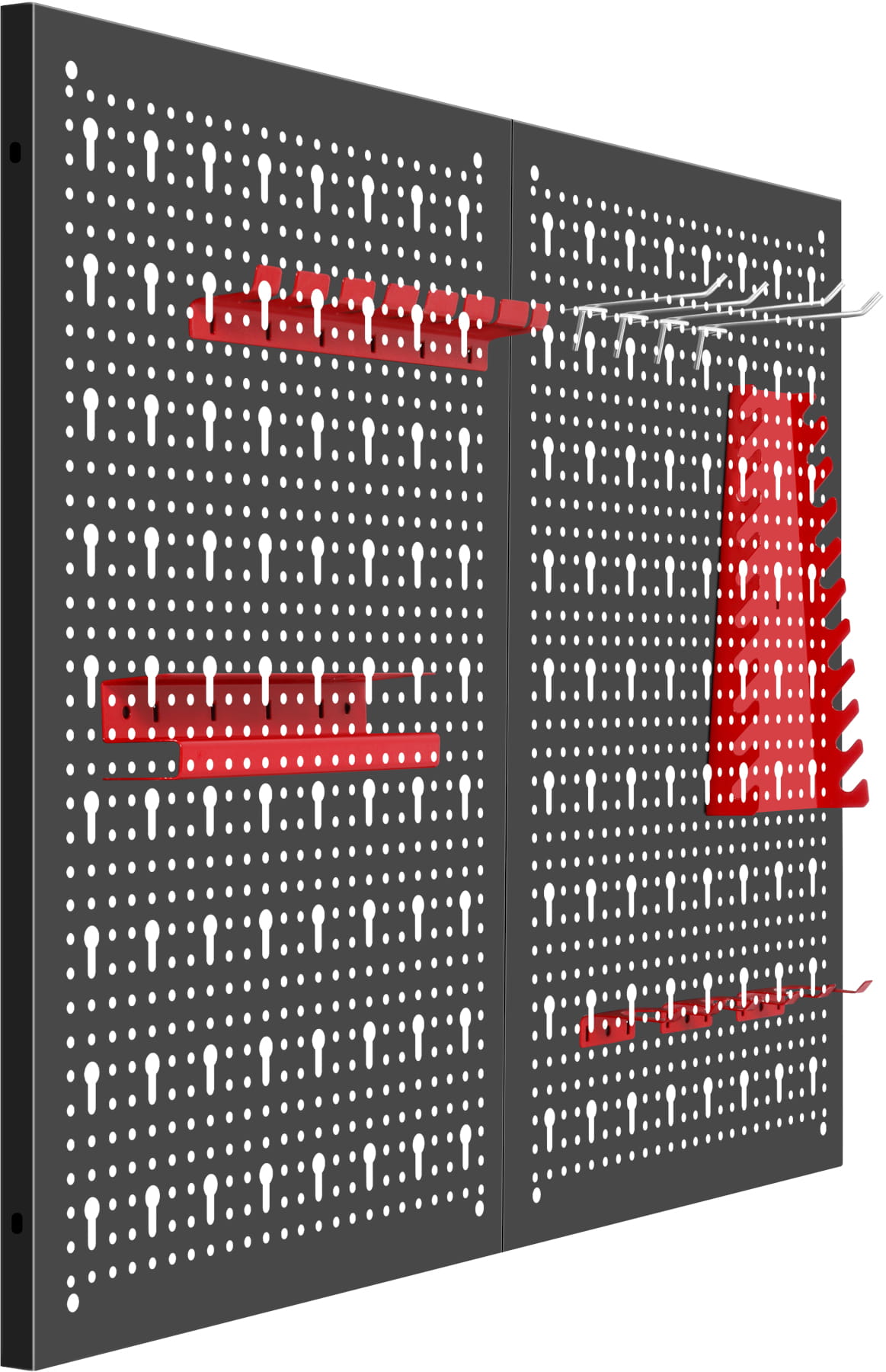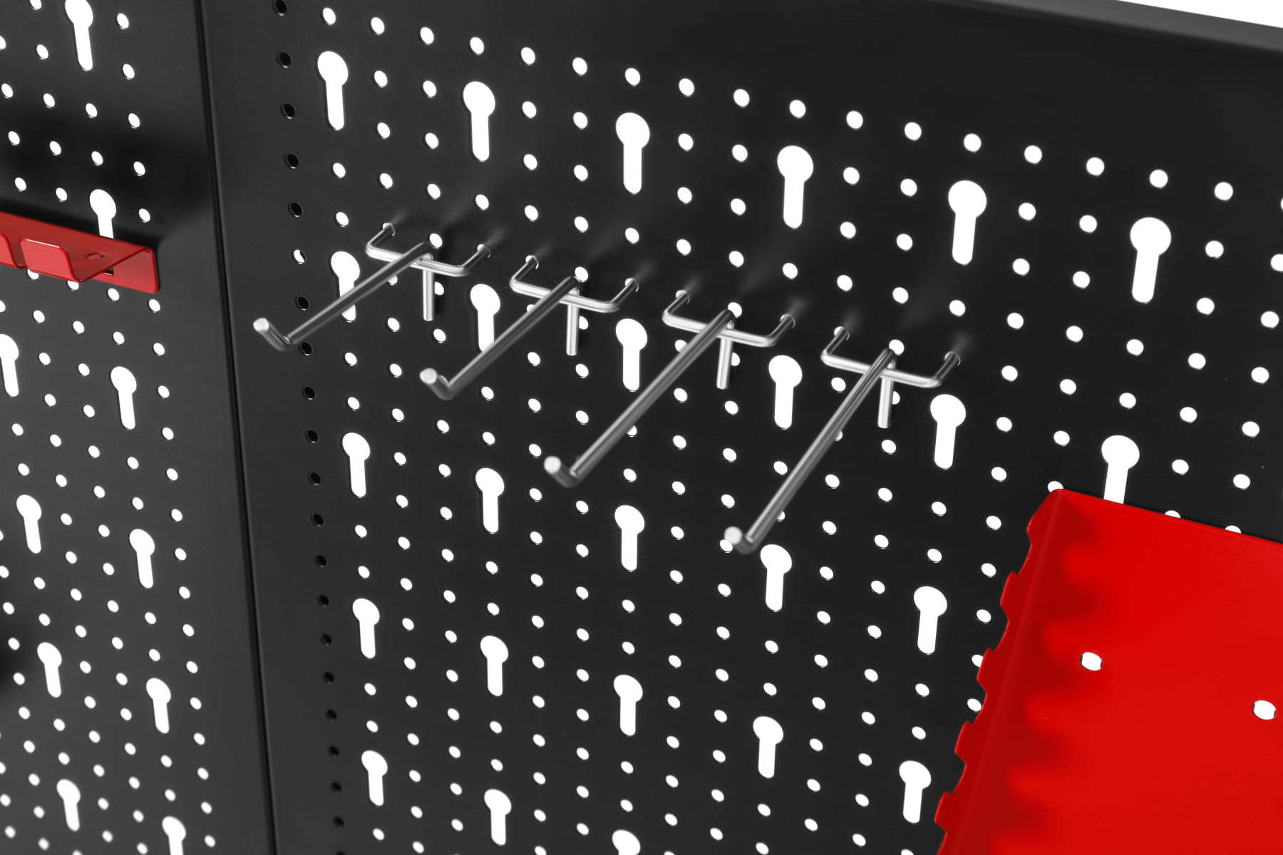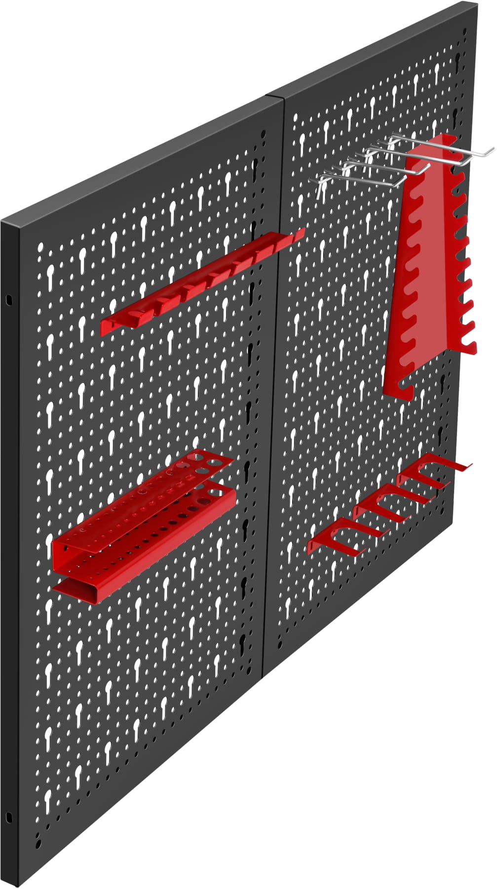 Dołączone metalowe uchwyty i wieszaki umożliwiają indywidualne rozmieszczenie elementów zgodnie z charakterem wykonywanej pracy. Układ można modyfikować w dowolnym momencie, dostosowując go do zmieniających się potrzeb lub rozbudowywanego zestawu narzędzi.