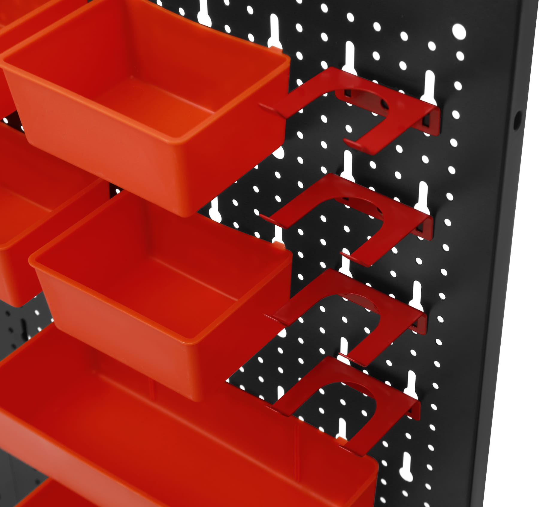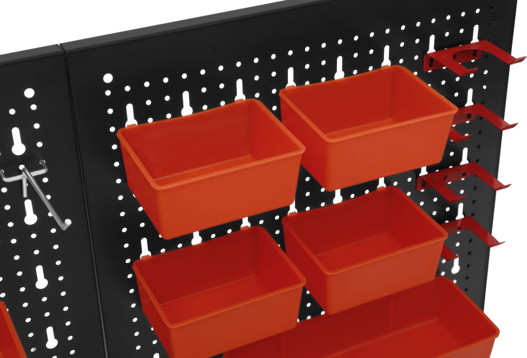 Dołączone pojemniki oraz uchwyty umożliwiają przechowywanie zarówno większych narzędzi, jak i drobnych elementów montażowych. Różne typy wieszaków pozwalają na wygodne rozmieszczenie kluczy, śrubokrętów, szczypiec i innych narzędzi ręcznych, co skraca czas potrzebny na ich odnalezienie podczas pracy.