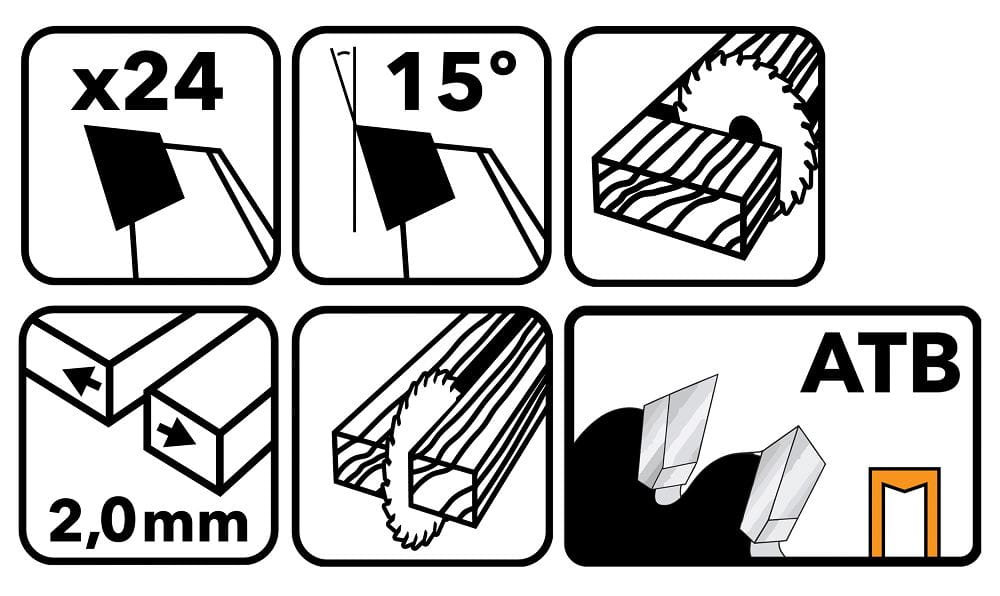 Tarcza została wykonana ze stali hartowanej, co zapewnia trwałość oraz odporność na odkształcenia podczas pracy. Dysk jest dodatkowo naprężany i wyposażony w szczeliny kompensacyjne, które redukują wpływ wysokich temperatur na stabilność pracy narzędzia. Geometria ATB (Alternate Top Bevel) zapewnia wysoką jakość krawędzi cięcia. Zęby tnące zostały wykonane z wysokiej jakości węglika spiekanego (TCT), co gwarantuje ich odporność na zużycie oraz możliwość pracy w kontakcie z przypadkowymi przeszkodami (np. gwoździe, resztki betonu).