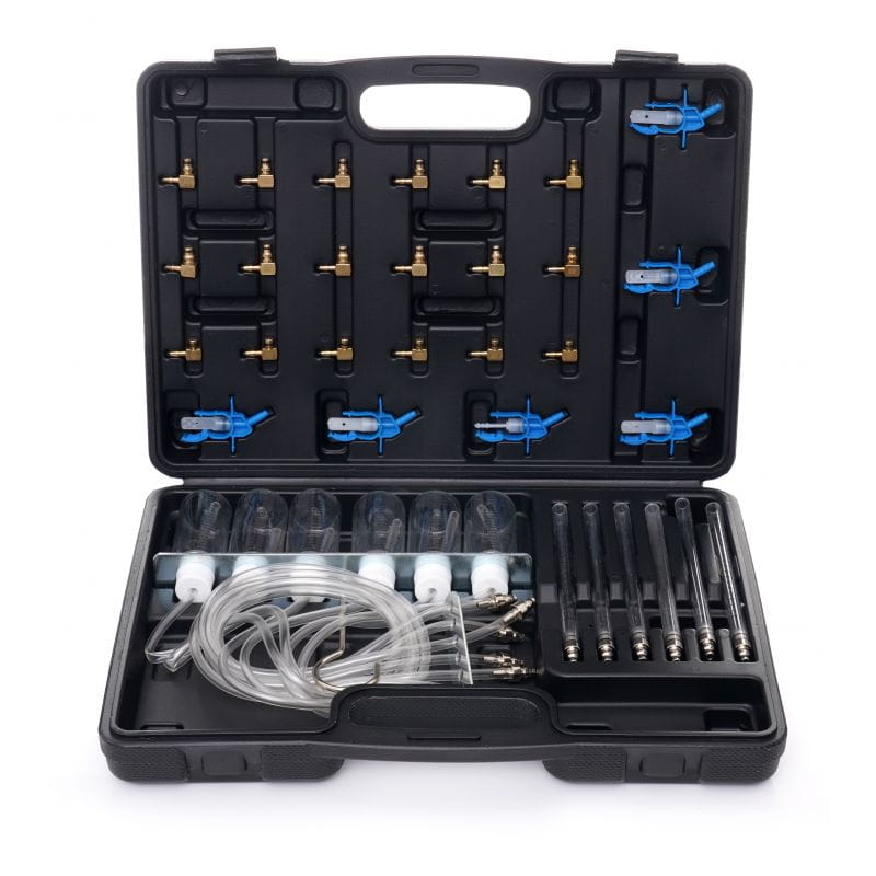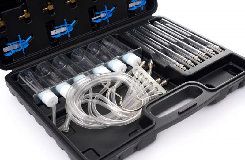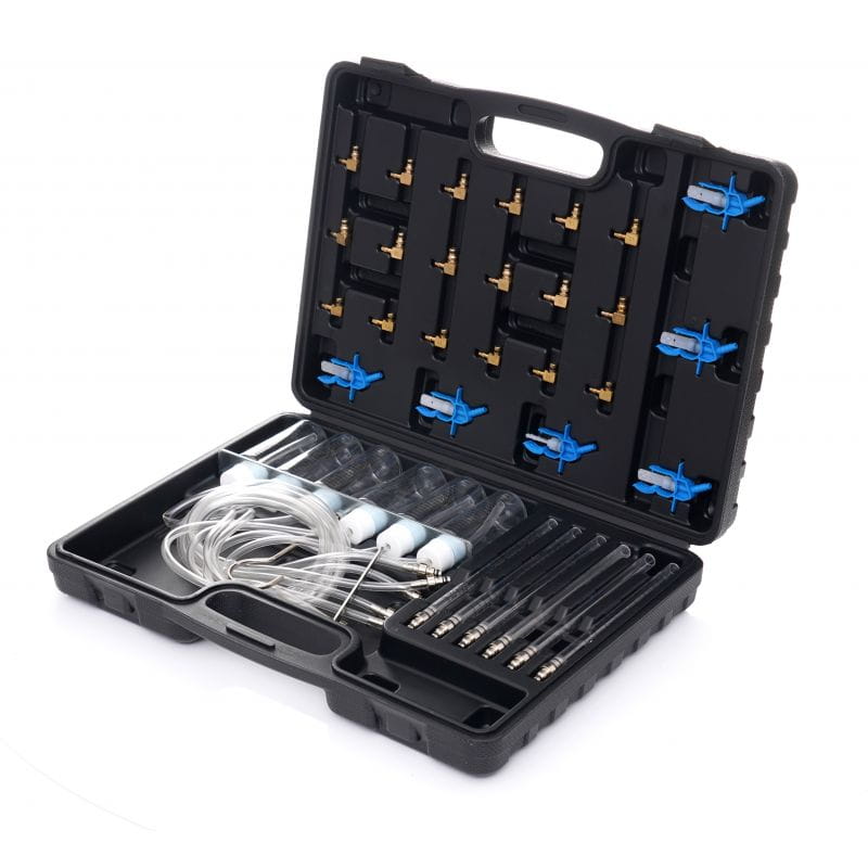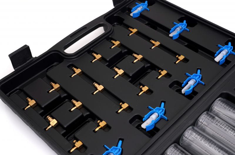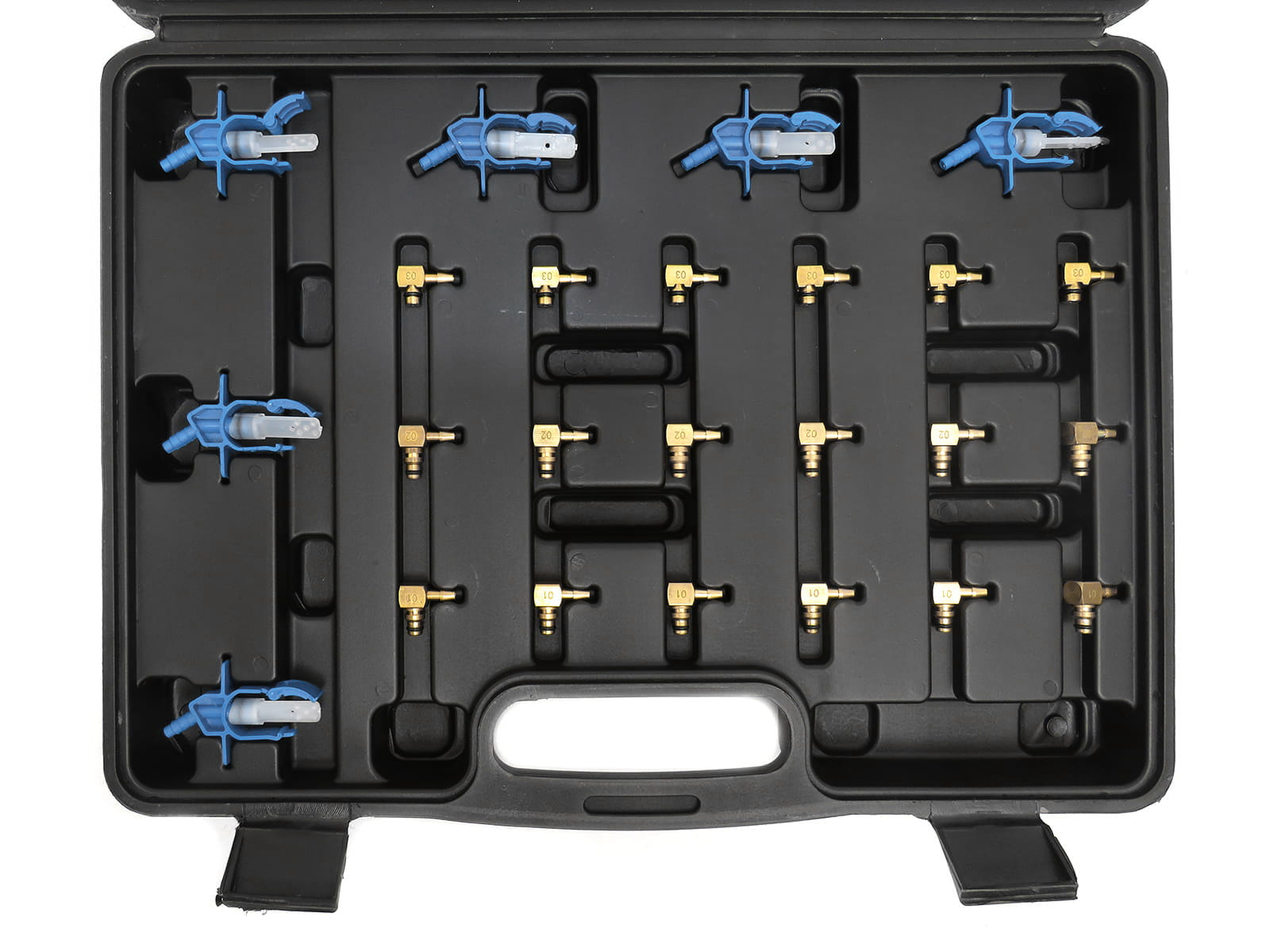 Bogaty zestaw końcówek i akcesoriów pozwala na pomiary układów wtryskowych firmy Bosch, Siemens, Denso, Delphi w silnikach do sześciu cylindrów.