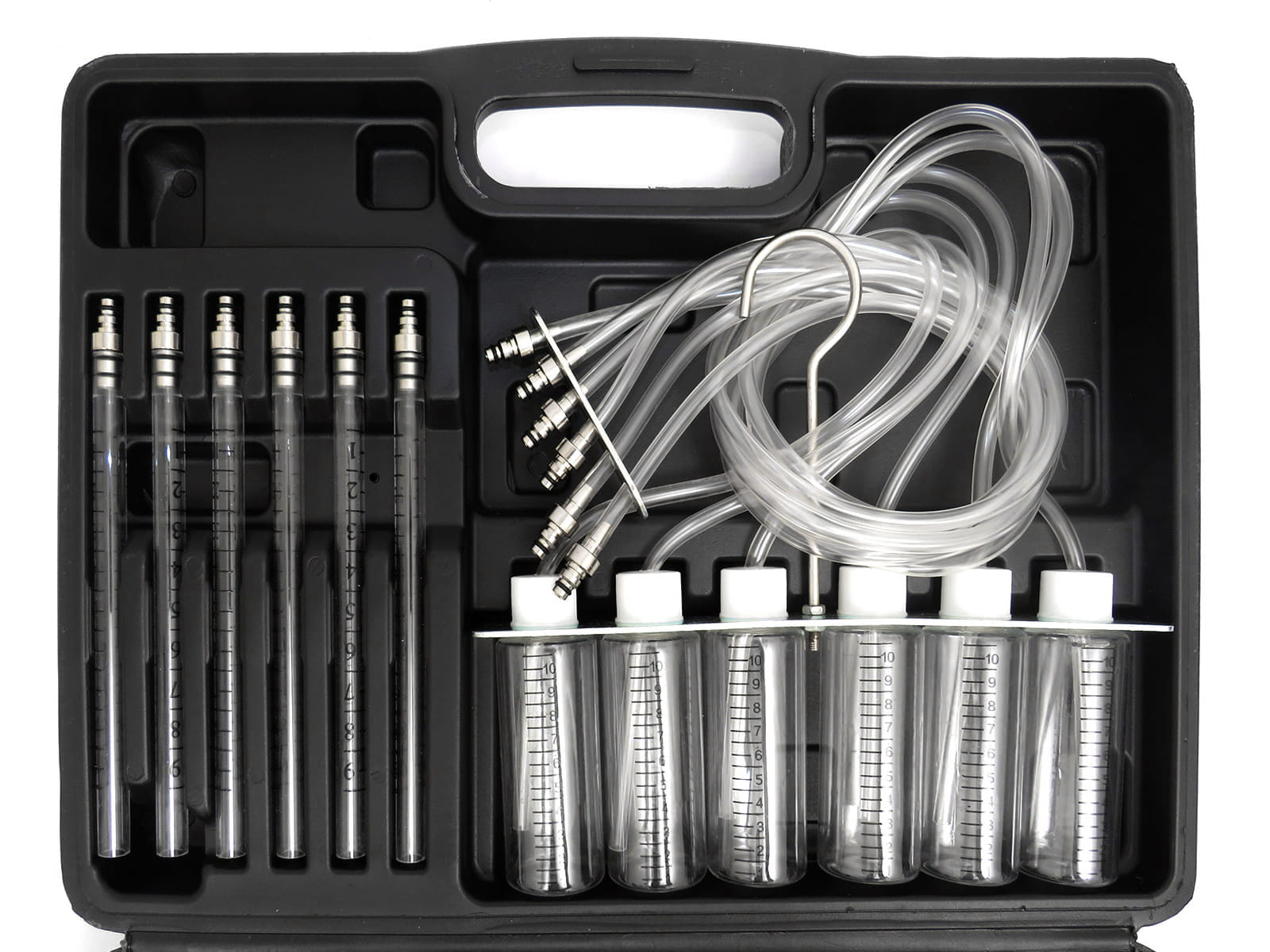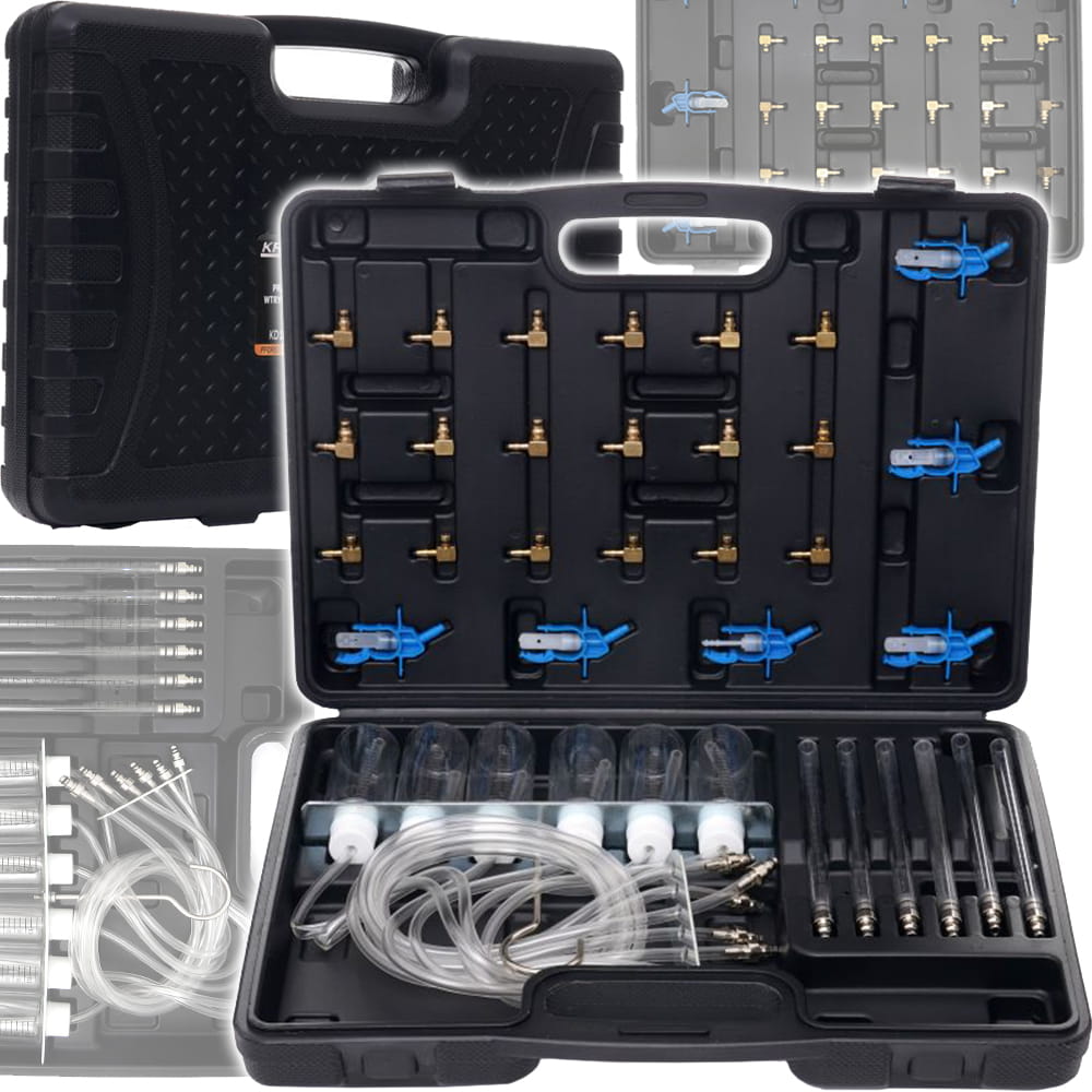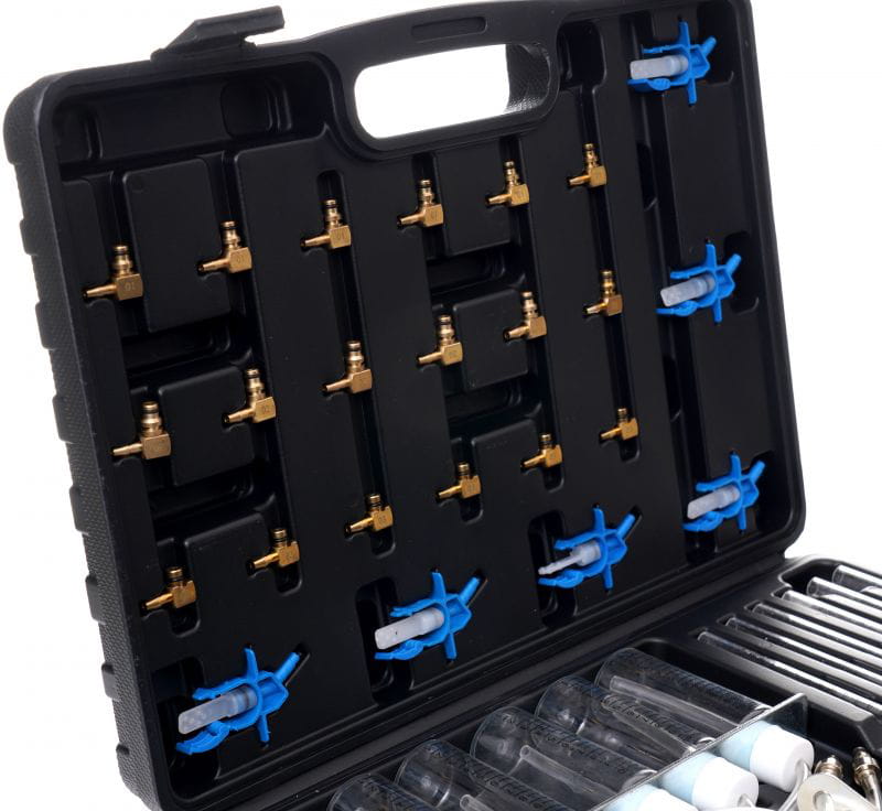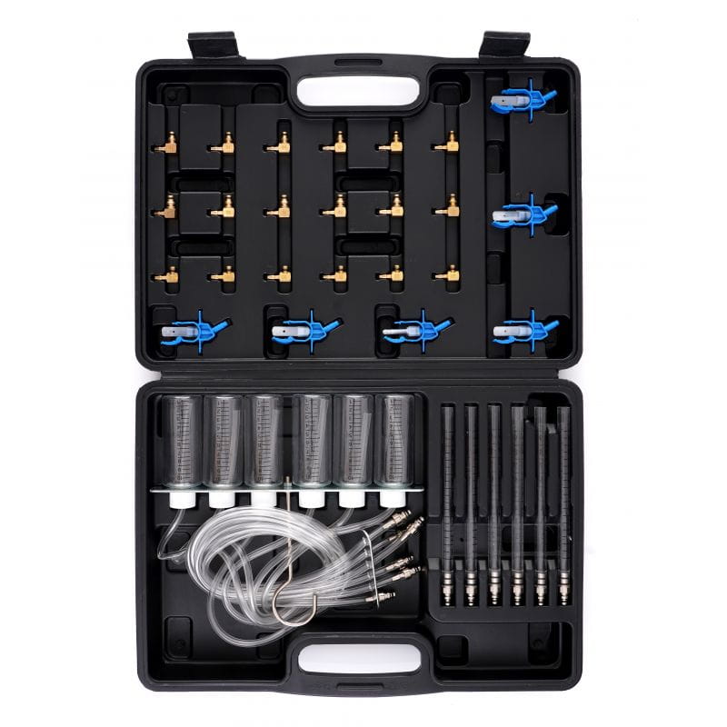Bogaty zestaw końcówek i akcesoriów pozwala na pomiary układów wtryskowych firmy Bosch, Siemens, Denso, Delphi w silnikach do sześciu cylindrów.