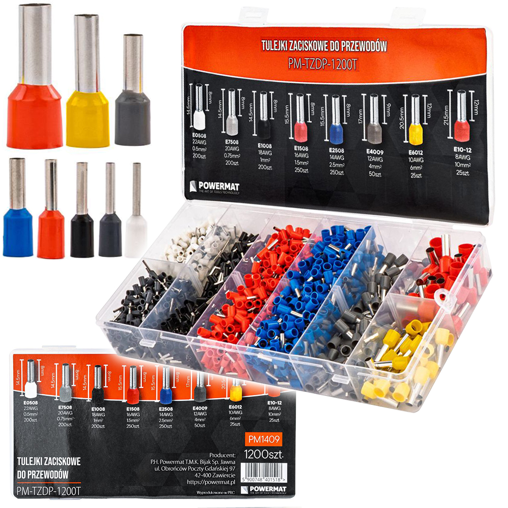 - Kompletny zestaw – 1200 tulejek w ośmiu popularnych rozmiarach pozwala obsłużyć szeroką gamę przewodów.