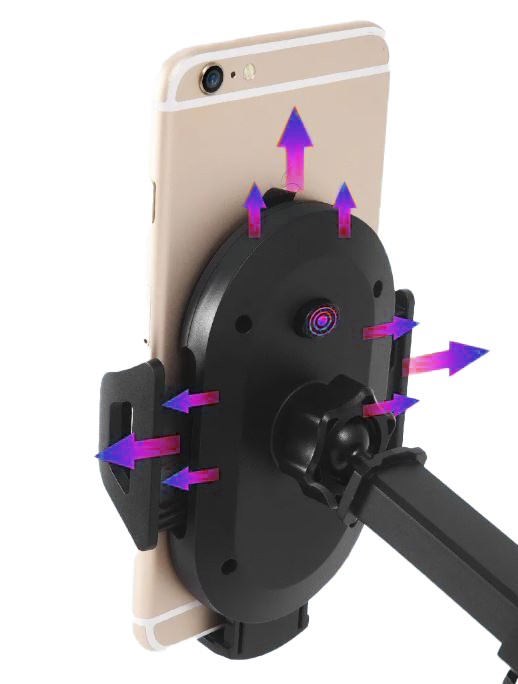 Z tyłu uchwytu znajduje się ergonomiczny przycisk, który automatycznie rozszerza ramiona po naciśnięciu. Mechanizm ten umożliwia łatwe umieszczanie i wyjmowanie telefonu jedną ręką. Po puszczeniu przycisku uchwyt automatycznie się blokuje, zapewniając solidne trzymanie urządzenia.