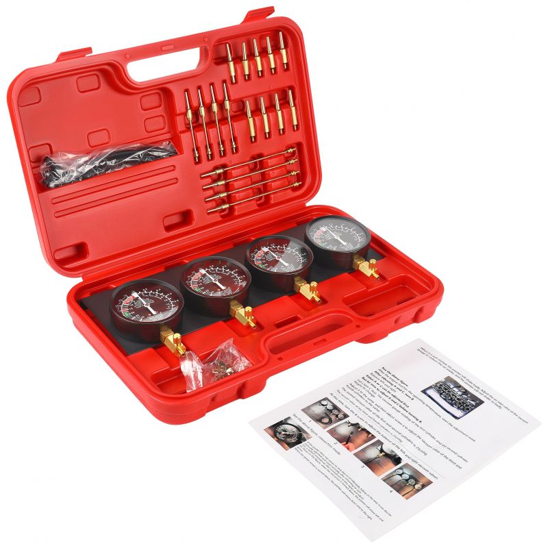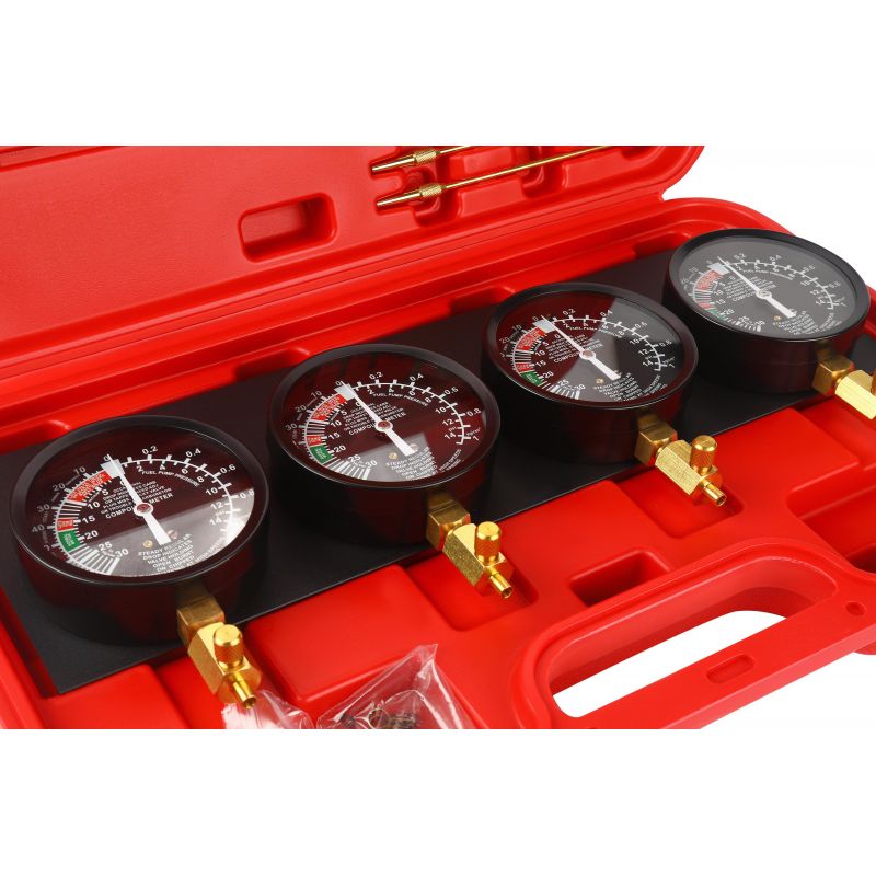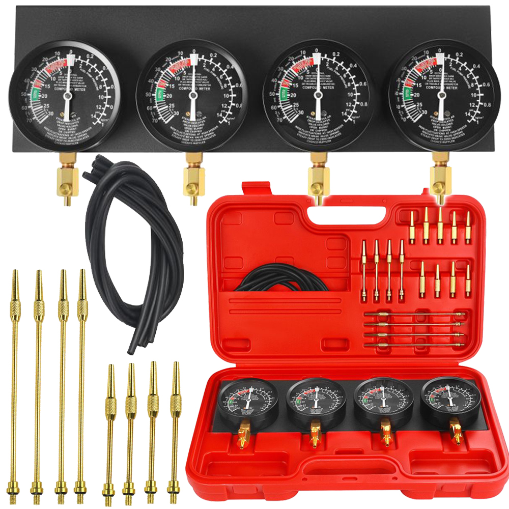 Zestaw wyposażony jest w cztery precyzyjne manometry o średnicy 93 mm, które gwarantują czytelny odczyt wartości podciśnienia. Każdy z nich osadzony jest w solidnej obudowie odpornej na drgania i uderzenia. Do zestawu dołączono elastyczne przewody gumowe o długości 900 mm, umożliwiające łatwy dostęp do trudno położonych gaźników, oraz komplet adapterów dopasowanych do różnych typów przyłączy stosowanych w motocyklach i samochodach. Wszystkie elementy umieszczono w praktycznej walizce transportowej, co ułatwia organizację pracy i przechowywanie zestawu.