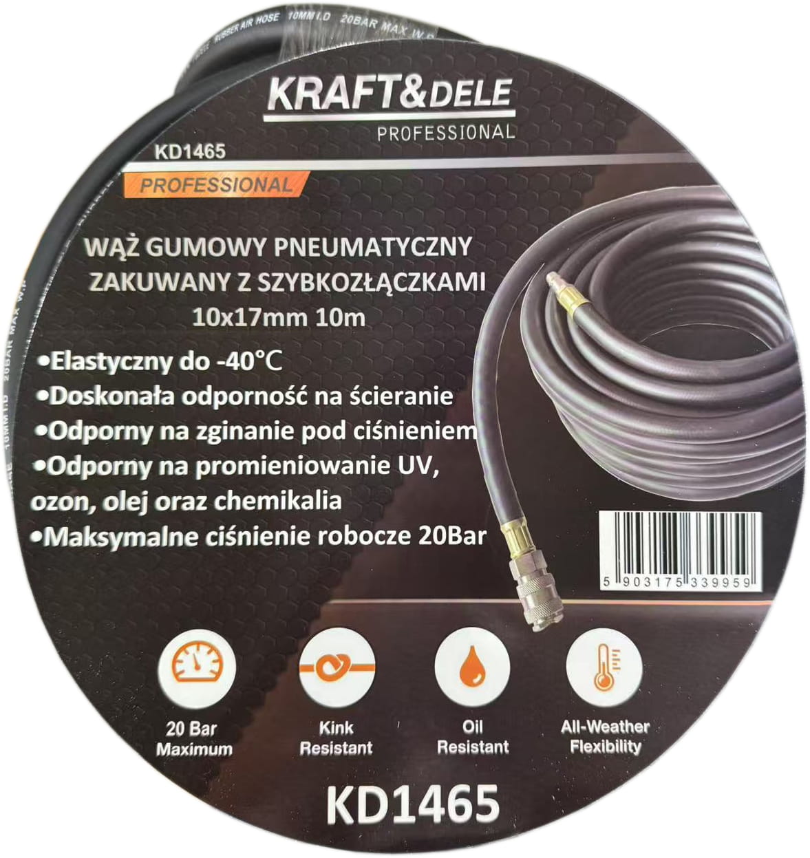 Wąż został zaprojektowany do pracy w wymagających środowiskach. Wysoka odporność na oleje, chemikalia oraz czynniki atmosferyczne pozwala na jego użytkowanie w trudnych warunkach warsztatowych i zewnętrznych. Zachowanie elastyczności w temperaturach do -40°C umożliwia pracę również w niskich temperaturach.