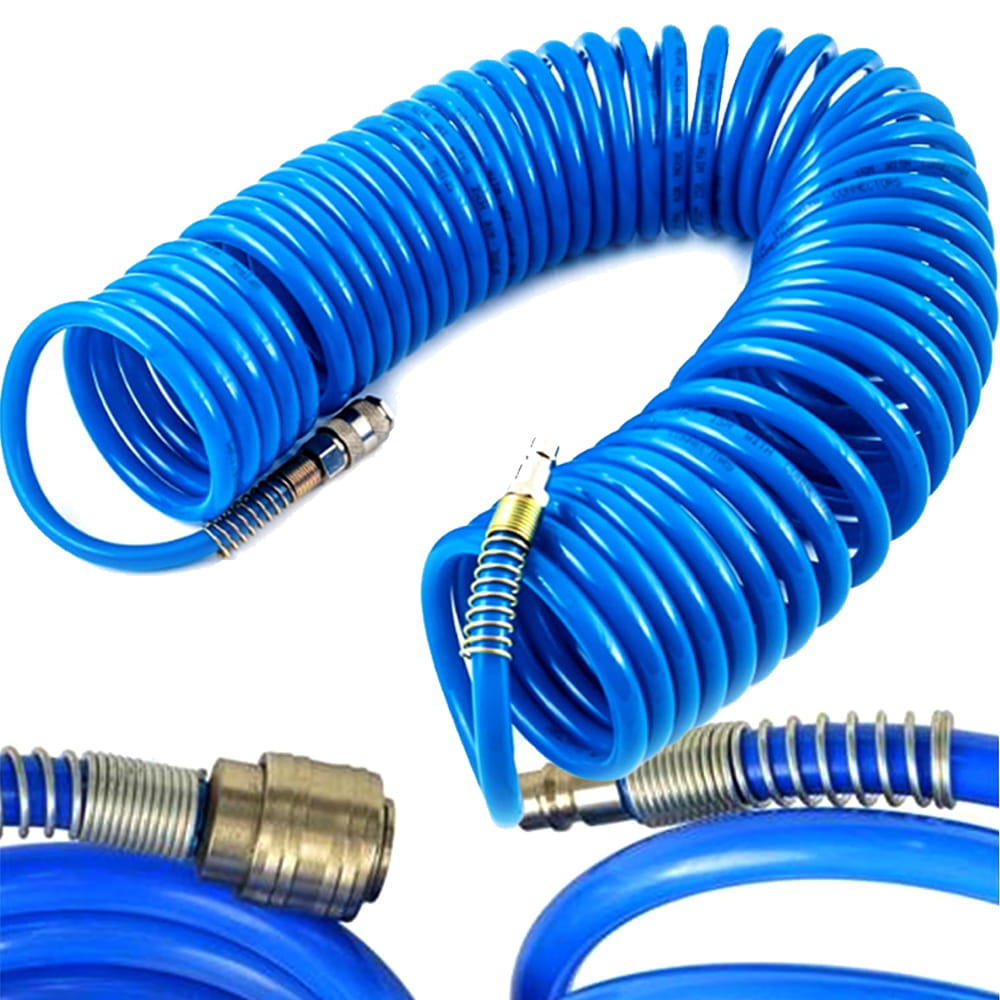 Wąż posiada szybkozłączki, dzięki czemu umożliwia błyskawiczne podłączenie każdego urządzenia pneumatycznego, od razu jest gotowy do pracy. Spiralność węża ułatwia jego przechowywanie i utrzymanie porządku w miejscy pracy. Wąż nie zajmuje dużej ilości miejsca i gdy z niego nie korzystamy wraca do swojej zwiniętej formy nie plącząc się pod nogami. Jaskrawy niebieski kolor zwiększa jego widoczność i zwiększa bezpieczeństwo pracy.