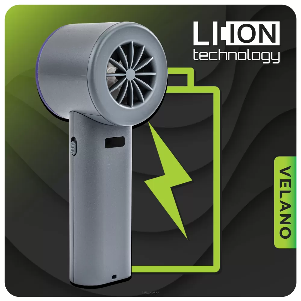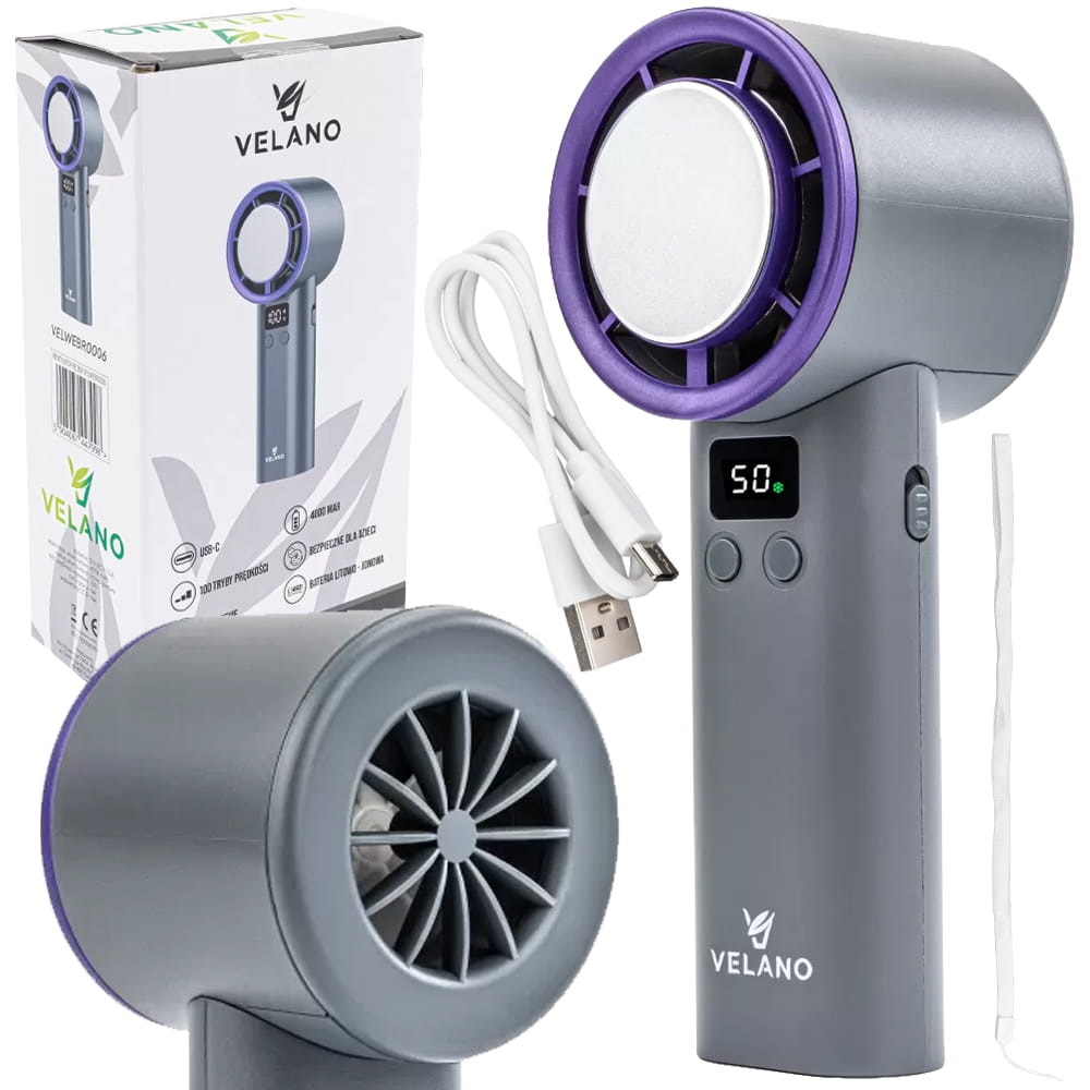 Wbudowany wyświetlacz LCD umożliwia łatwą kontrolę stanu baterii oraz aktualnej mocy nawiewu. Urządzenie ładowane jest przez uniwersalne złącze USB-C, co pozwala na uzupełnienie energii z powerbanka, laptopa czy ładowarki sieciowej. Do zestawu dołączono przewód o długości 80 cm, umożliwiający wygodne podłączenie.