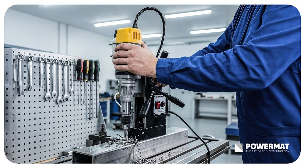 Podstawa magnetyczna umożliwia szybkie i stabilne zamocowanie urządzenia do stalowych powierzchni bez konieczności stosowania dodatkowych uchwytów. Stałe położenie urządzenia ogranicza ryzyko przesunięć i poprawia dokładność wykonywanych otworów, co przekłada się na lepszą jakość pracy.