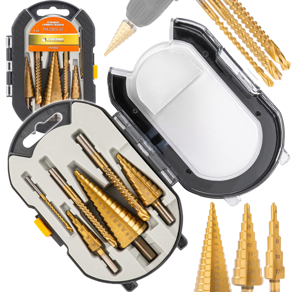 Zestaw wierteł stopniowych i frezujących to komplet narzędzi przeznaczonych do precyzyjnej obróbki otworów w różnorodnych materiałach. Łączy funkcjonalność trzech wierteł stopniowych o szerokim zakresie średnic z trzema wiertłami frezującymi zaprojektowanymi do prac wykończeniowych. Konstrukcja z wytrzymałej stali szybkotnącej HSS zapewnia odporność na zużycie oraz stabilność działania podczas intensywnej eksploatacji.