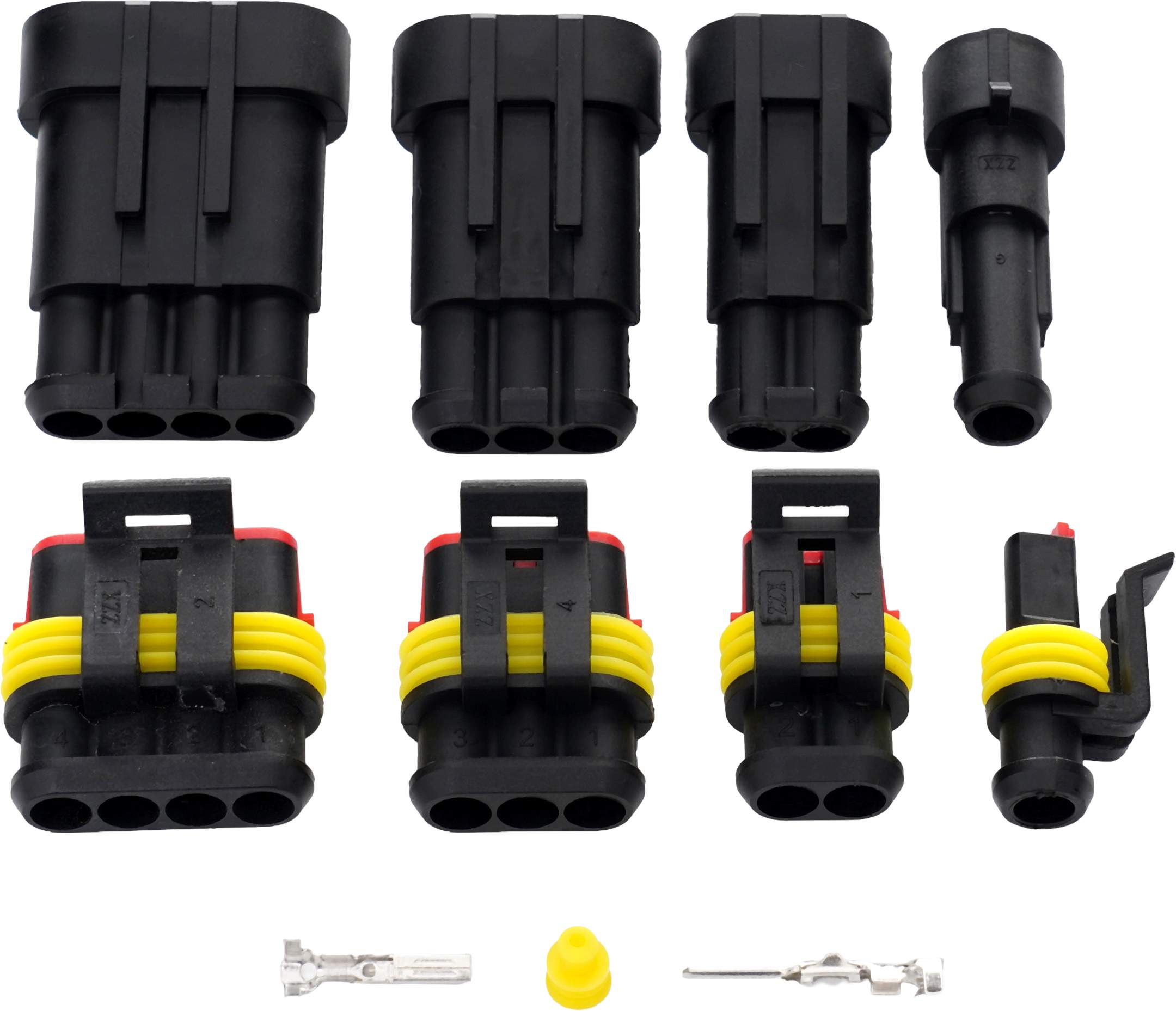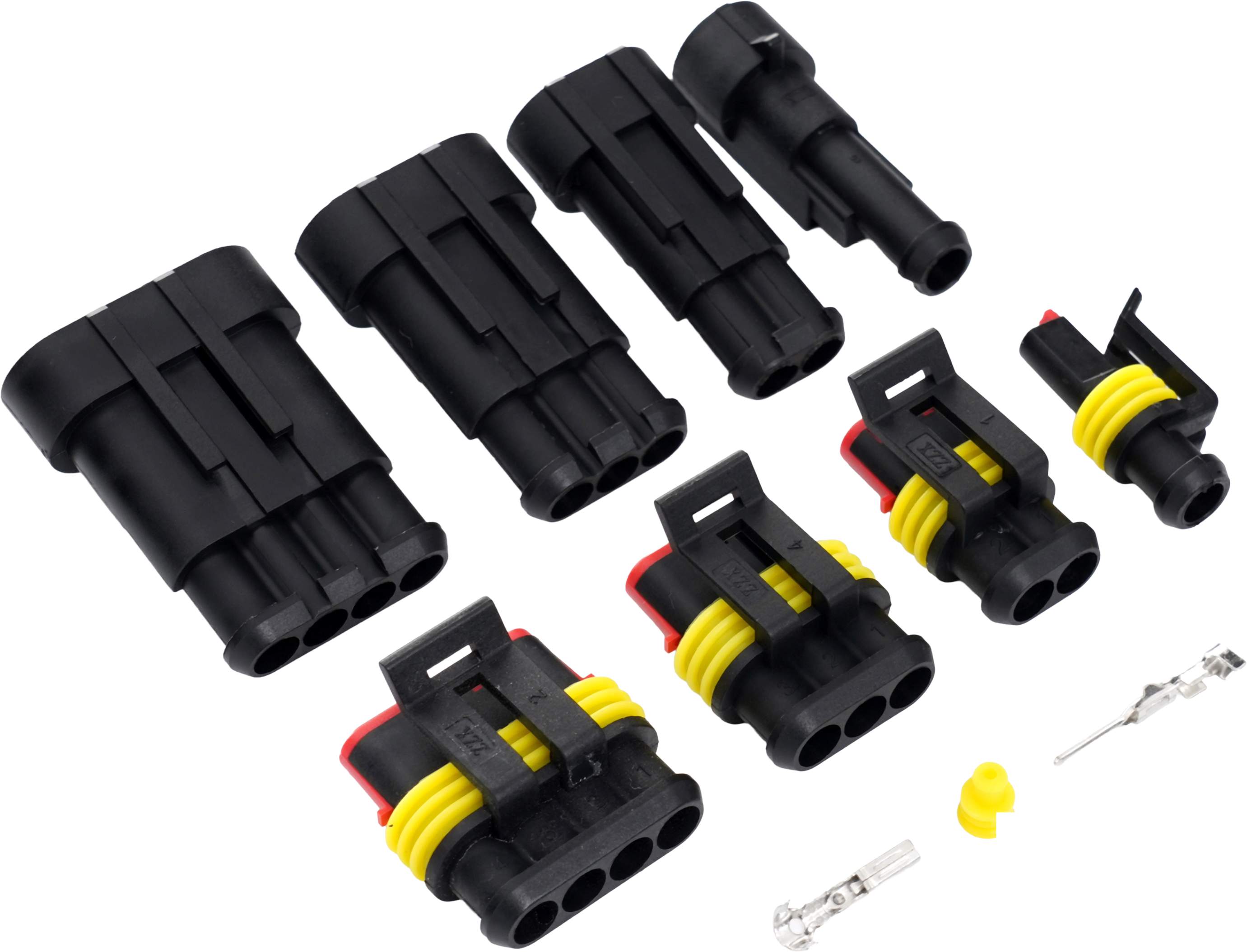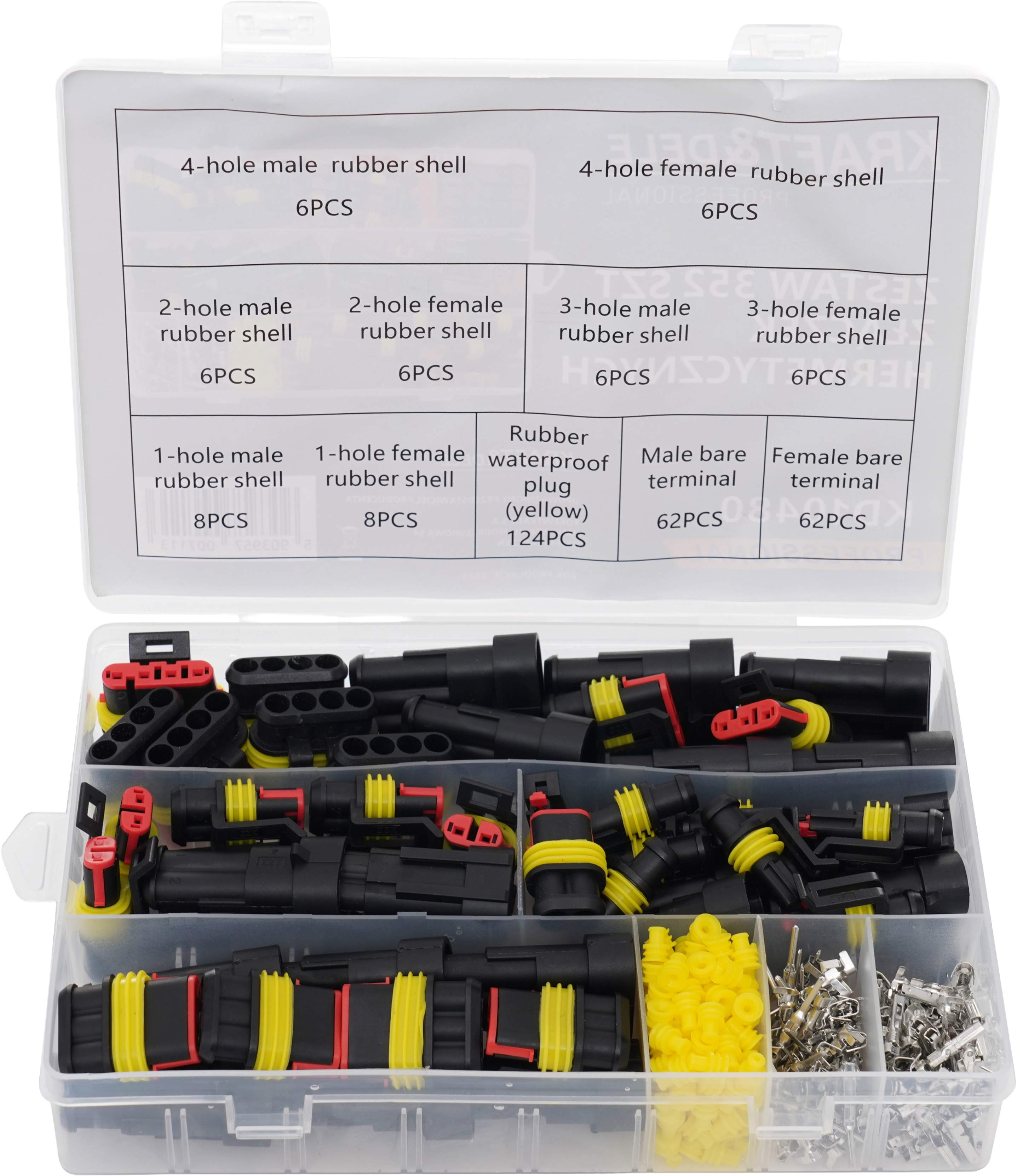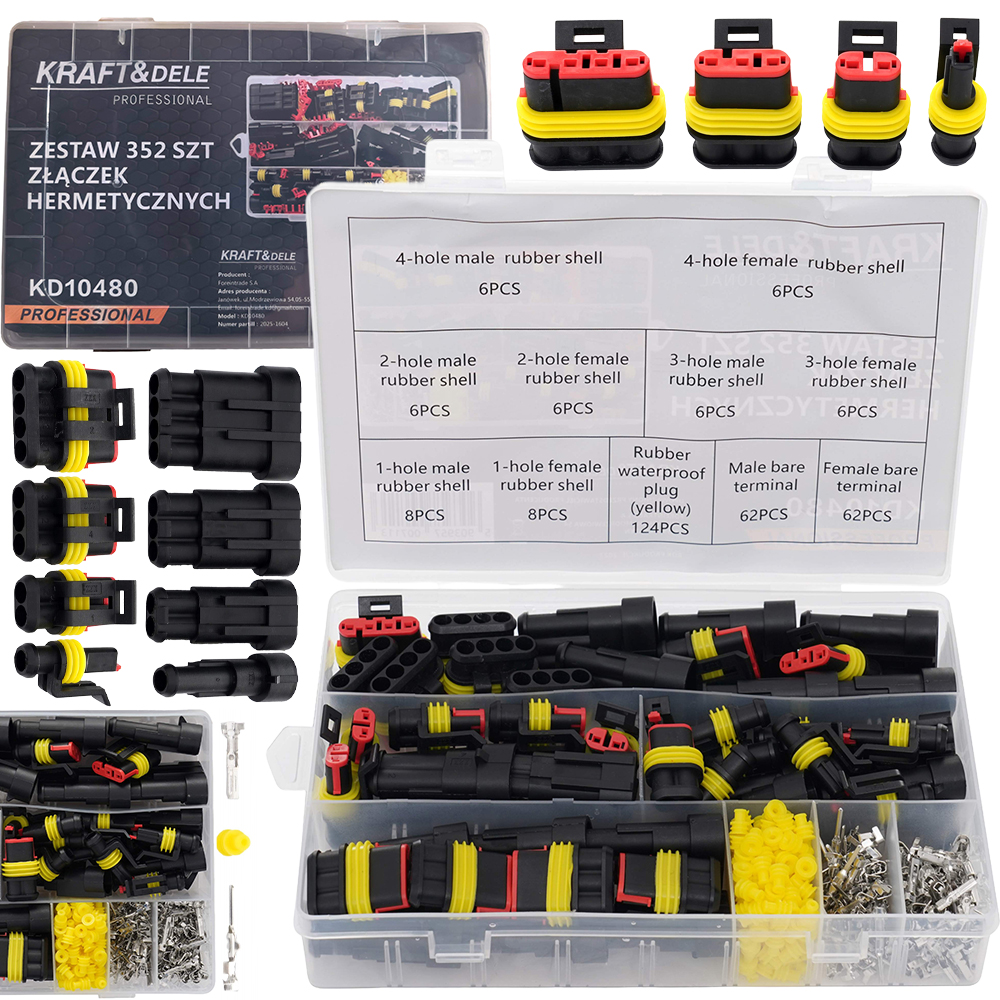 - Złącza 2 PIN: 6 x obudowa męska, 6 x obudowa żeńska, 12 x pin męski, 12 x pin żeński, 24 x uszczelka silikonowa