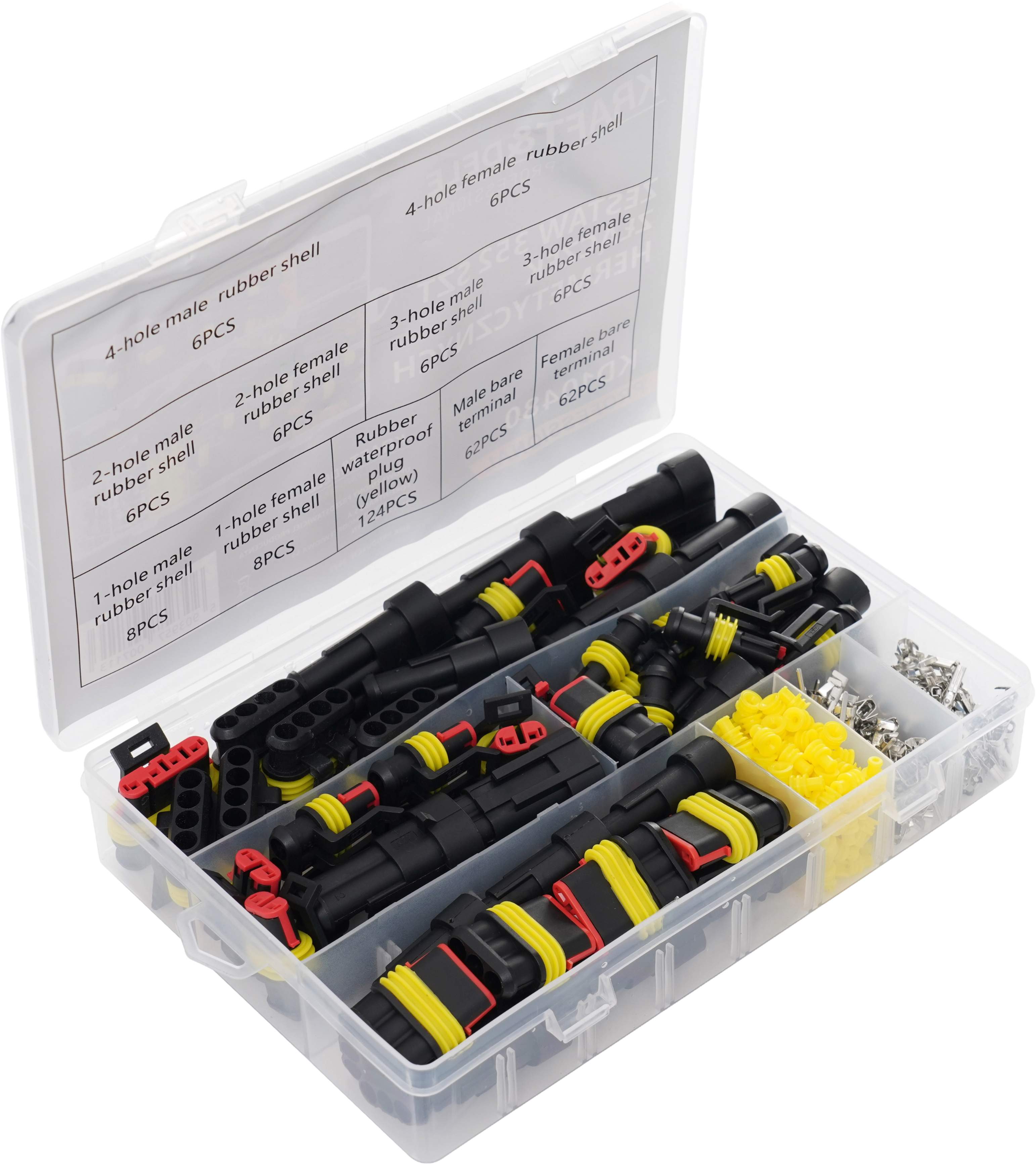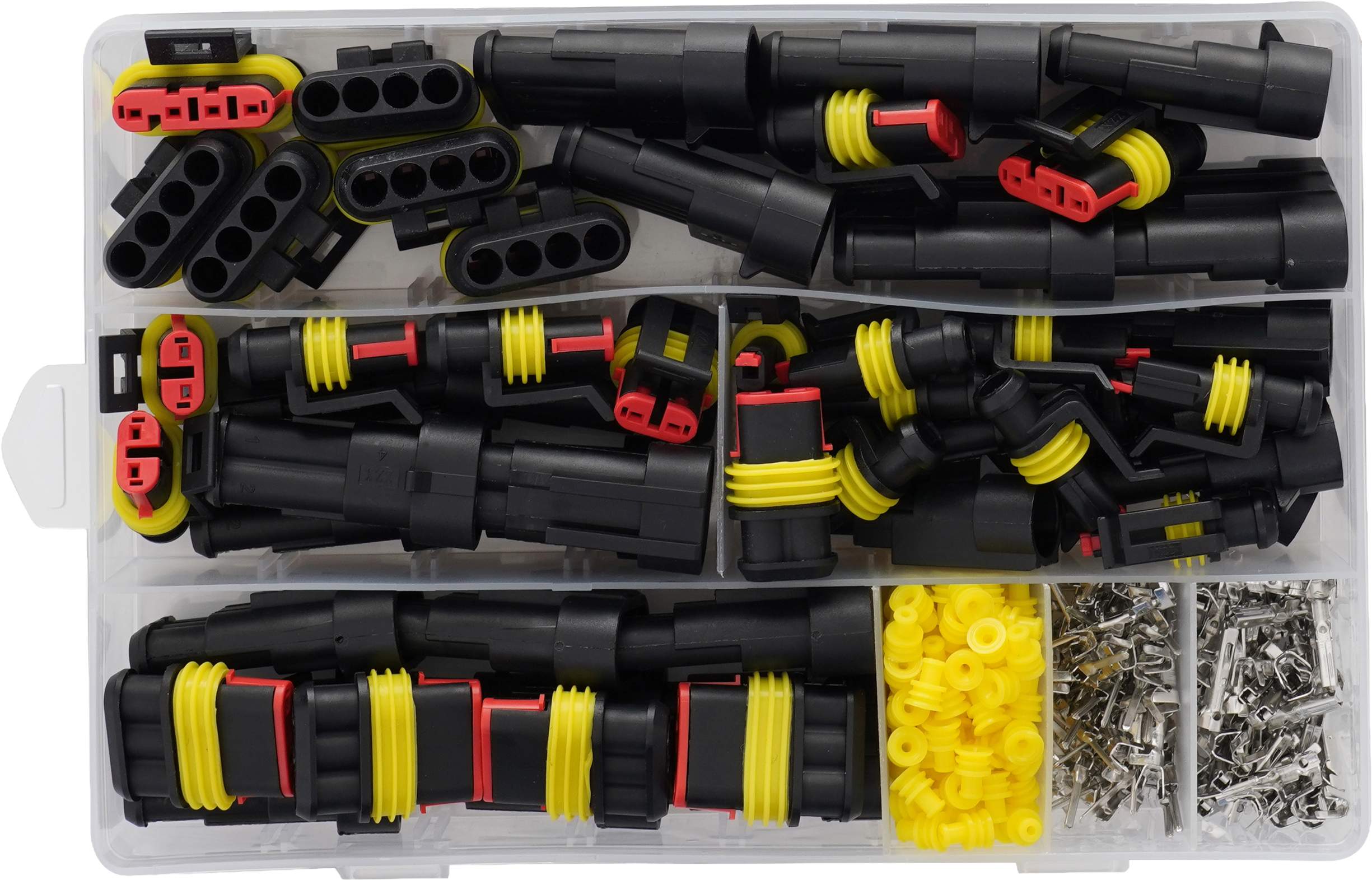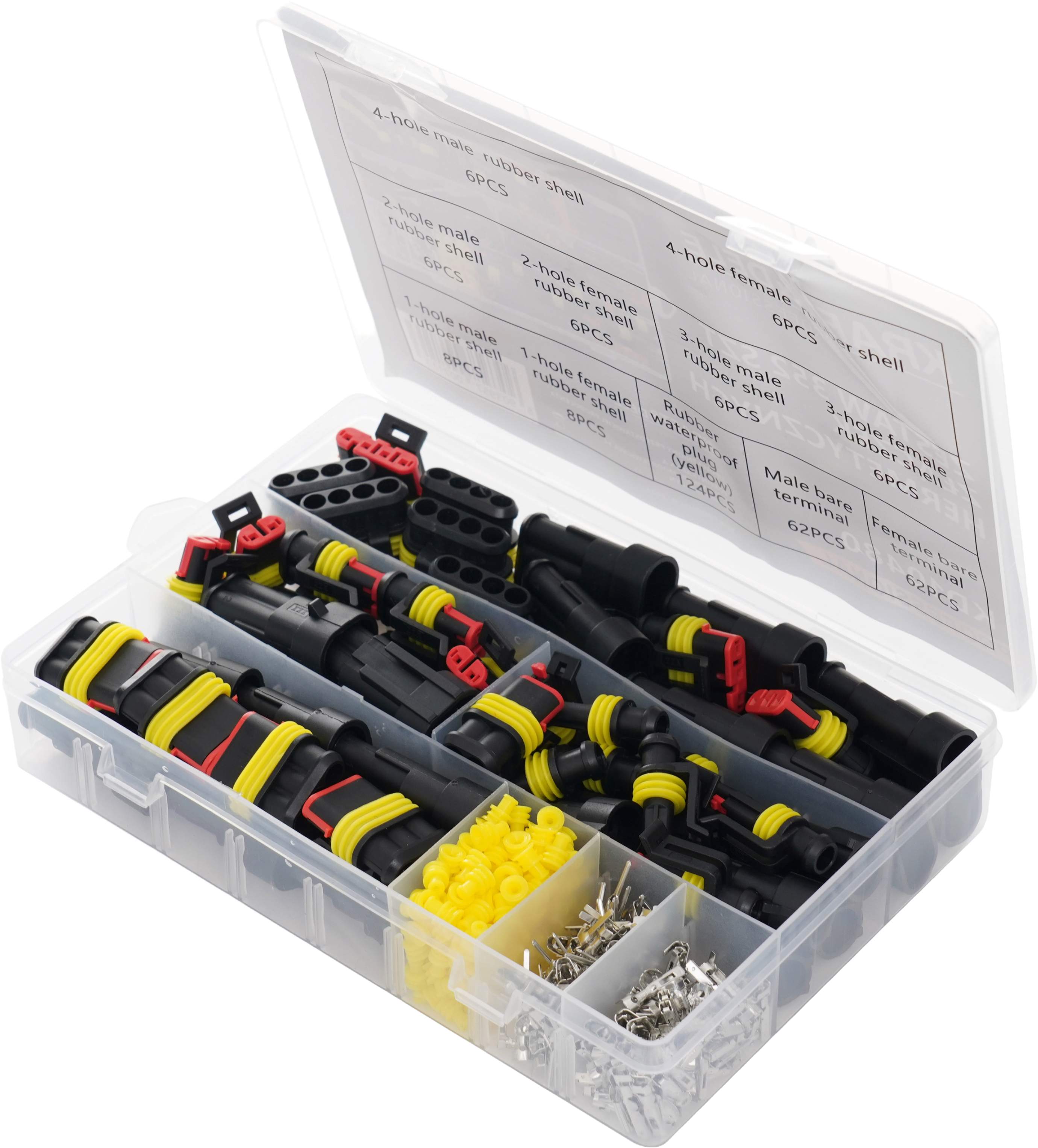 - Złącza 2 PIN: 6 x obudowa męska, 6 x obudowa żeńska, 12 x pin męski, 12 x pin żeński, 24 x uszczelka silikonowa