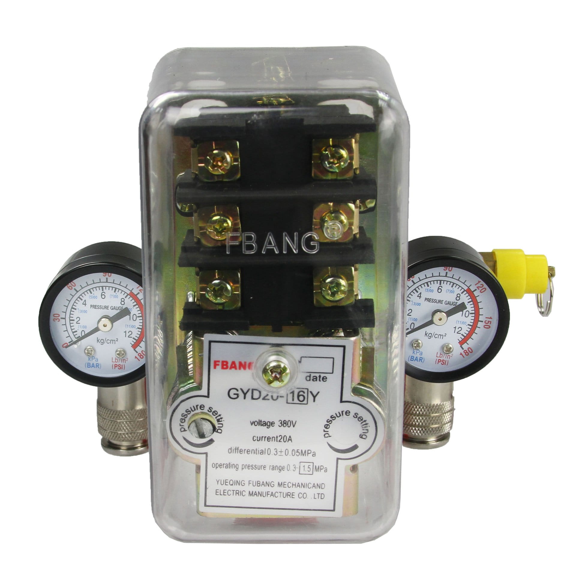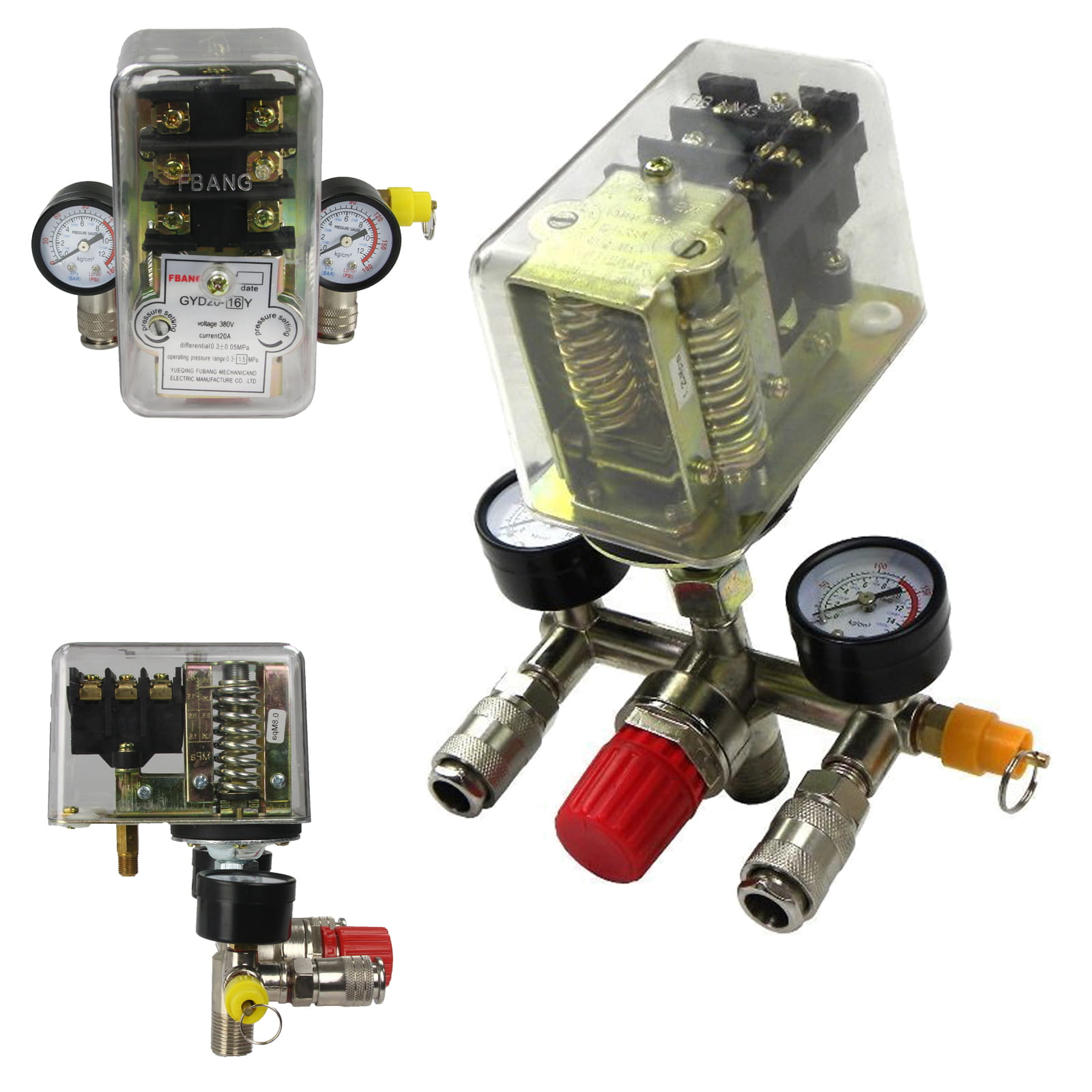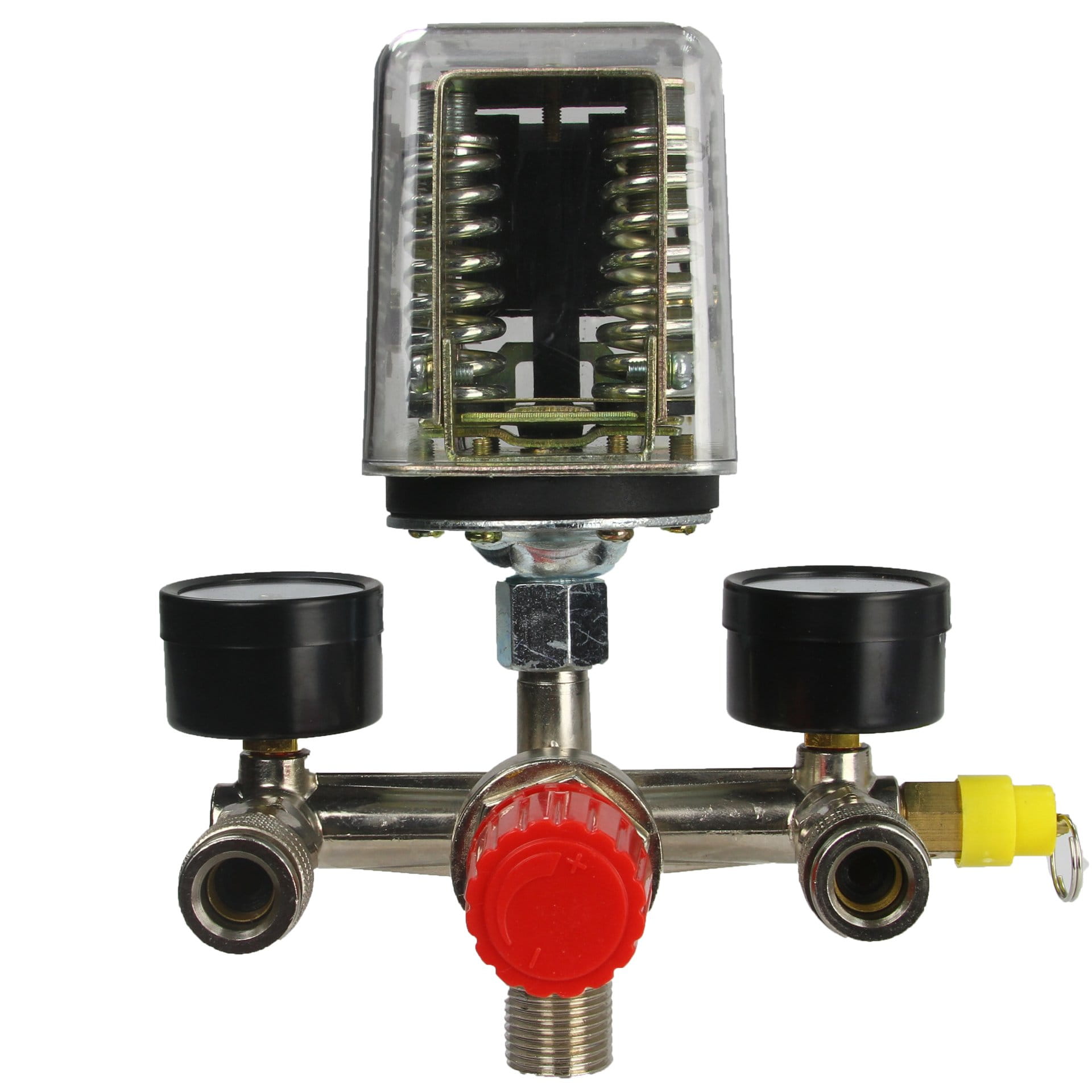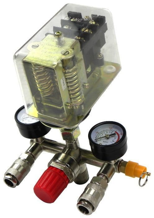 Wysokiej jakości presostat ciśnieniowy z kolektorem i dwoma szybkozłączkami i manometrami przeznaczony do kompresorów ciśnieniowych.