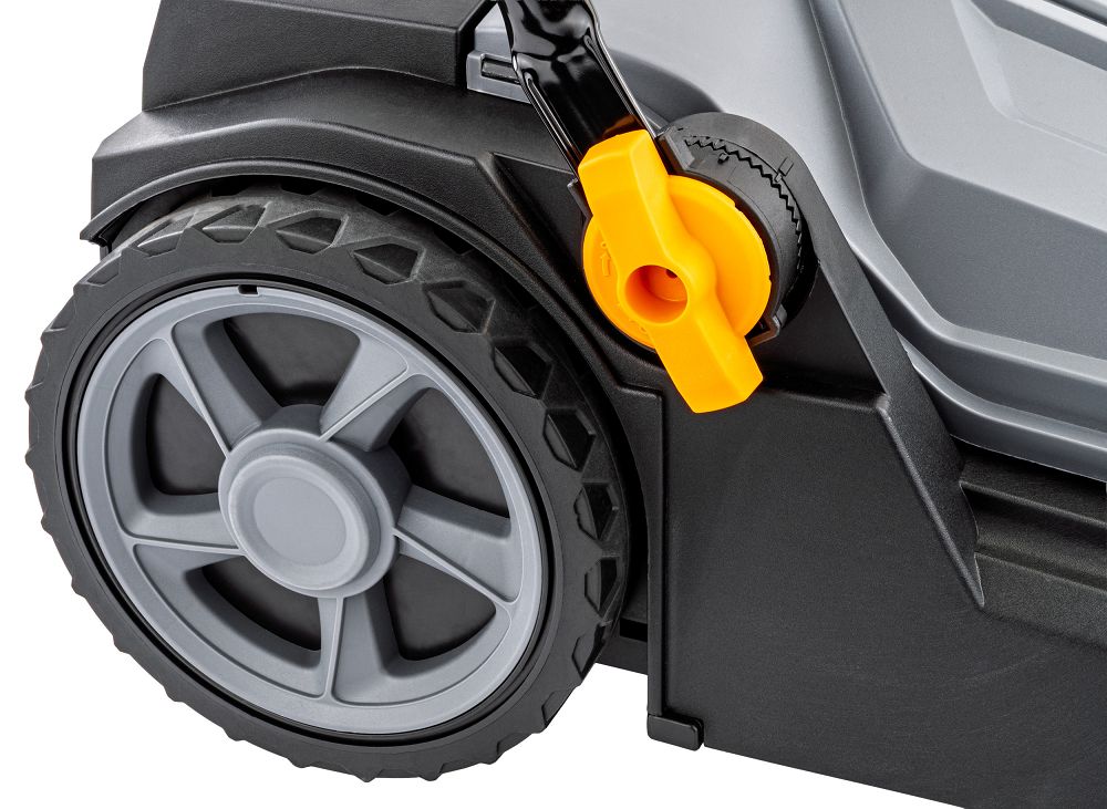 Dzięki dużym gumowanym kołom i przedniemu kółku obrotowemu zamiatarka prowadzi się lekko i stabilnie, nawet na nierównych nawierzchniach.
