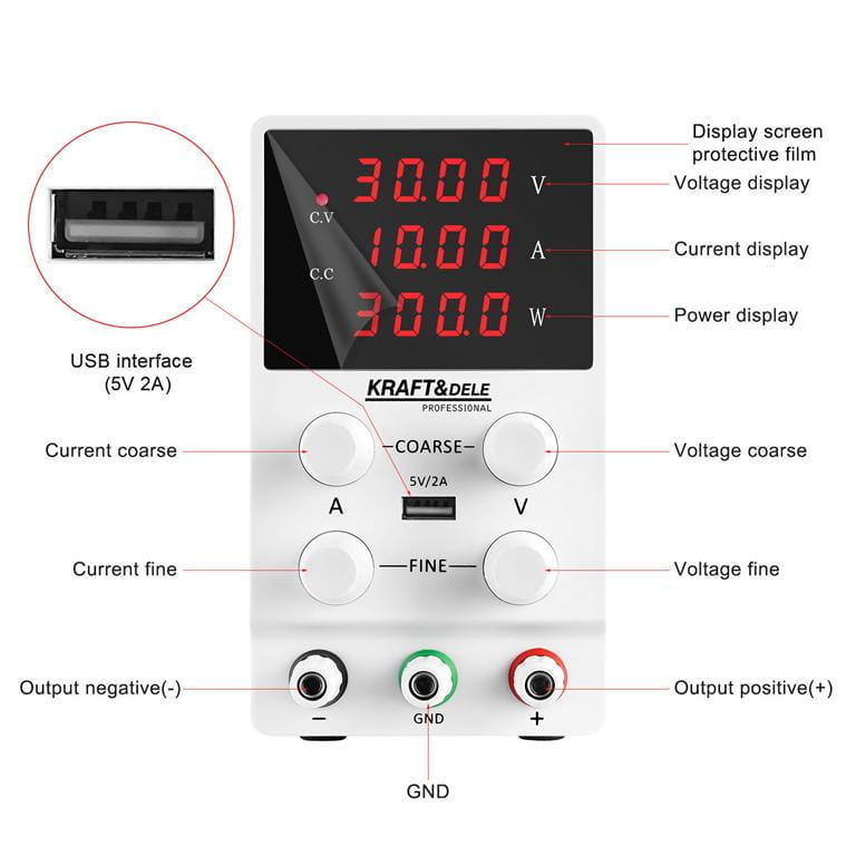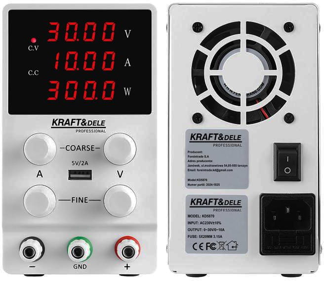 - Wysoka precyzja regulacji – możliwość ustawienia napięcia w zakresie 0–30V oraz prądu do 10A pozwala na szerokie zastosowanie w elektronice