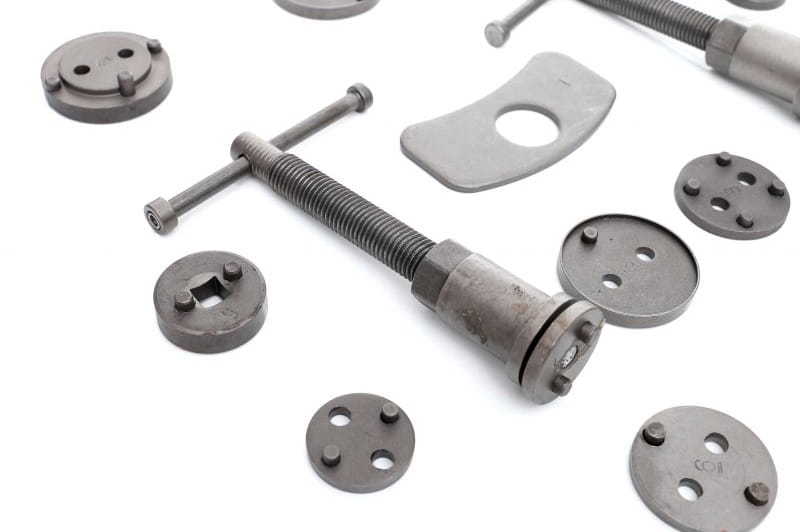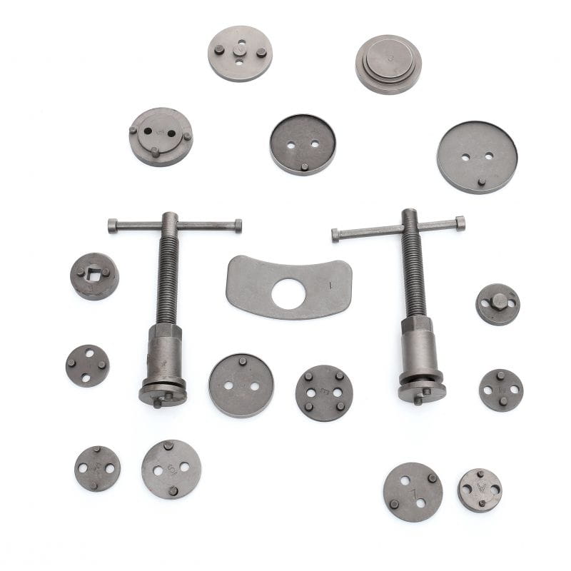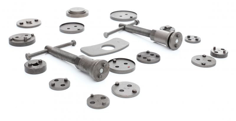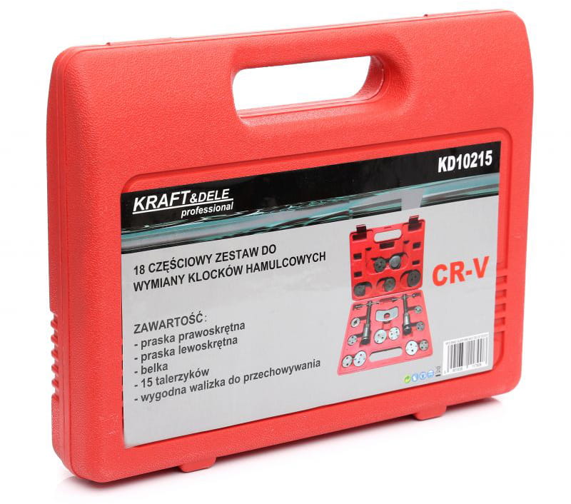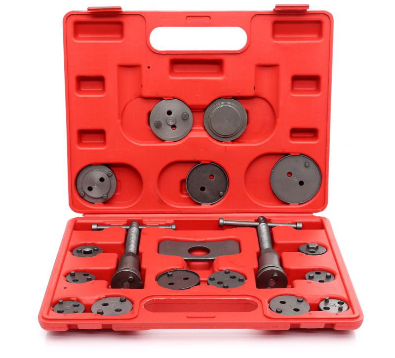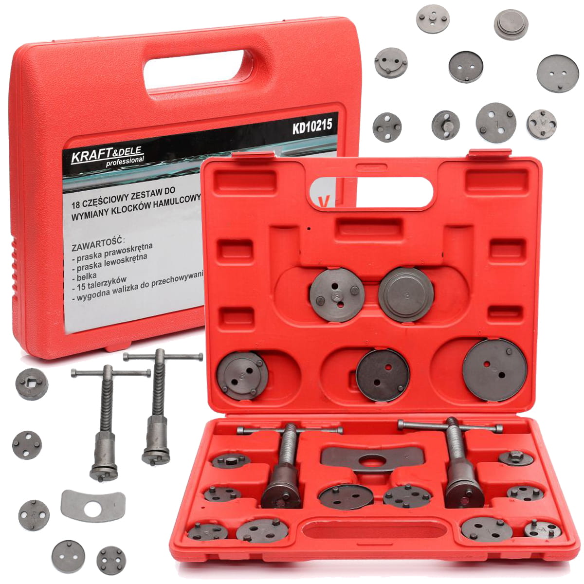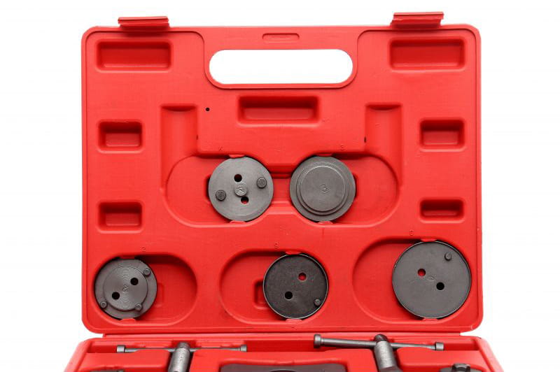 Bogaty zestaw do wyciskania tłoczków hamulcowych. Polecamy mechanikom w serwisach samochodowych oraz do przydomowych warsztatów. Przeznaczony do samochodów z układem hamulcowym tarczowym.