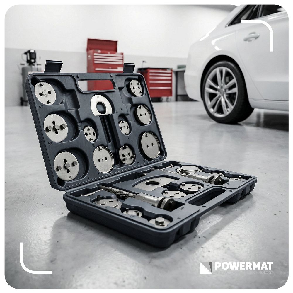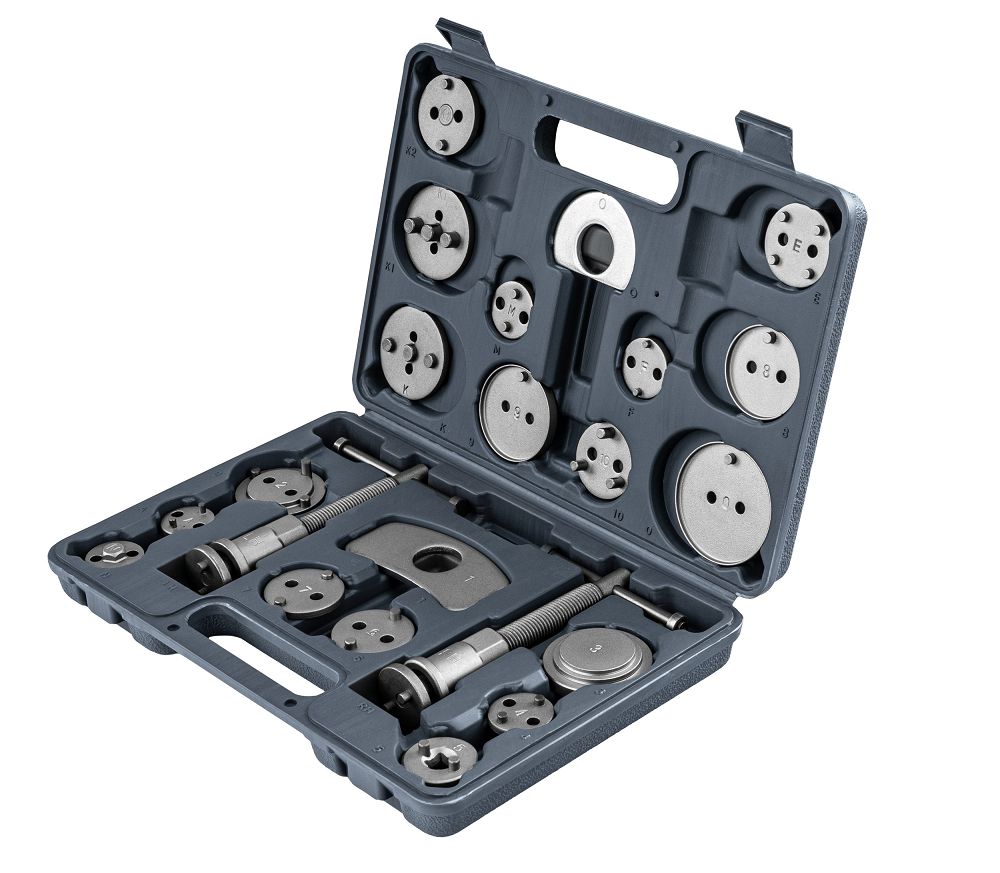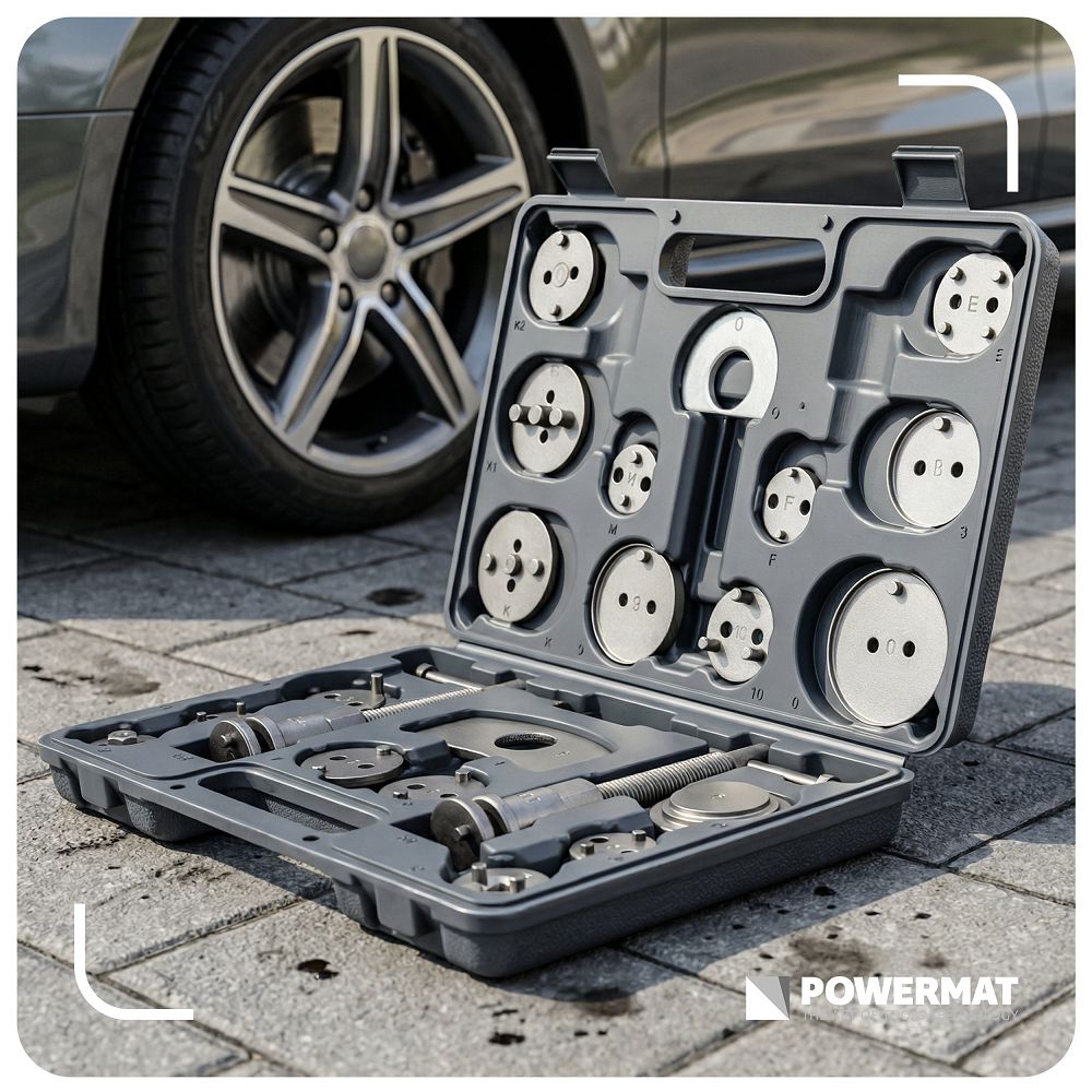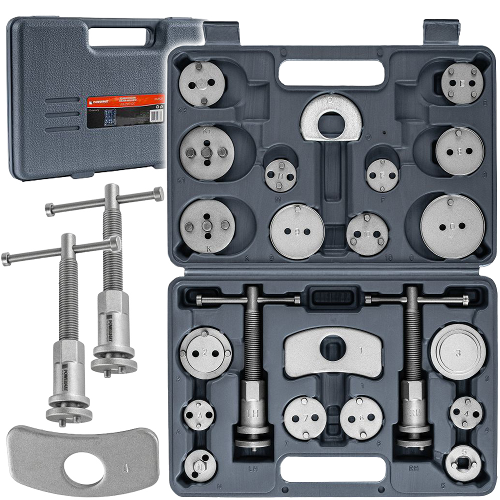 - Uniwersalność zastosowania – 20 adapterów umożliwia dopasowanie do wielu typów tłoczków hamulcowych