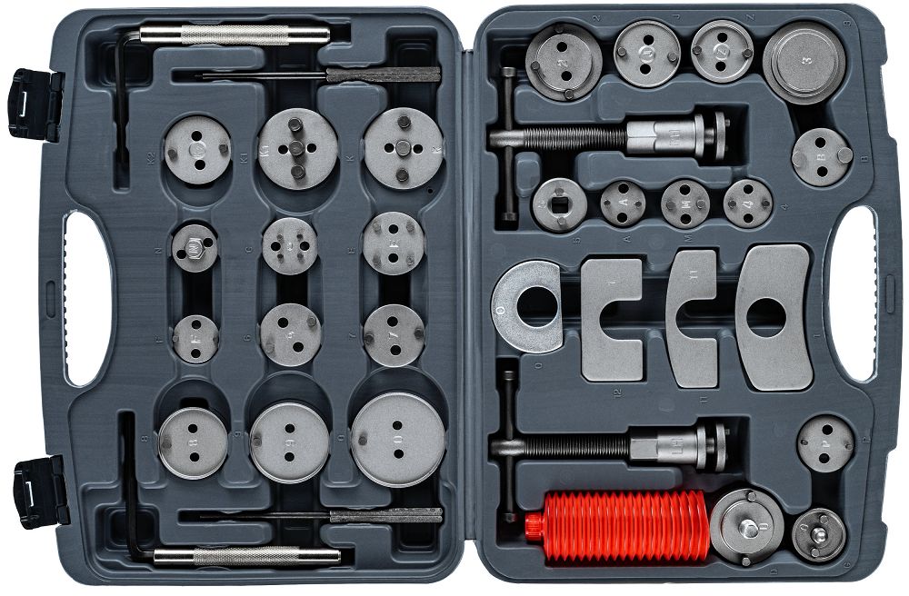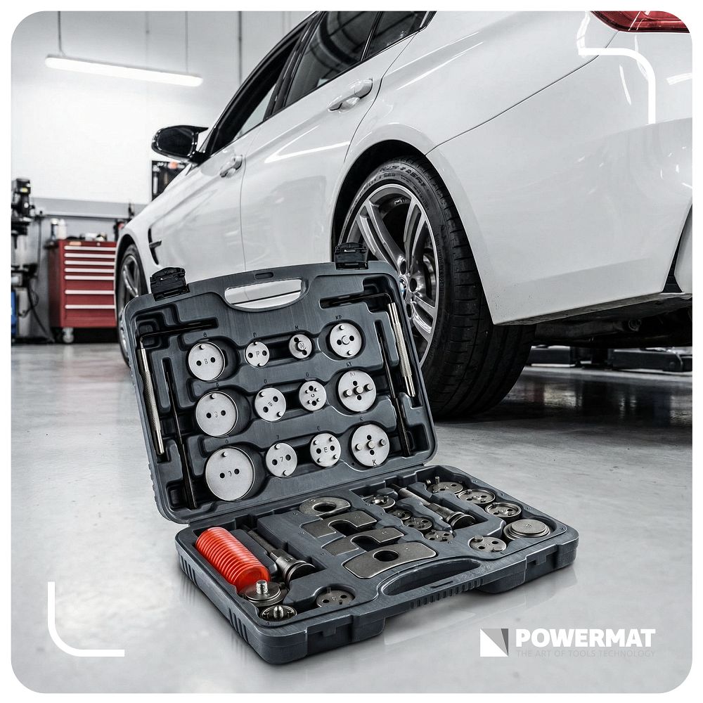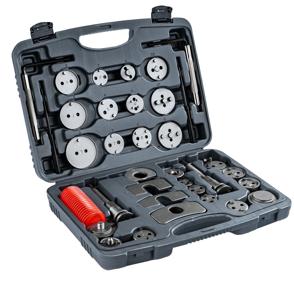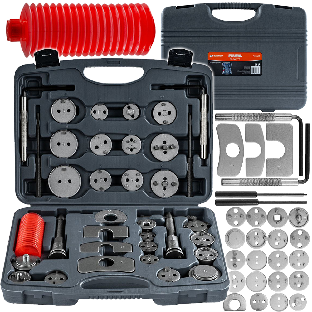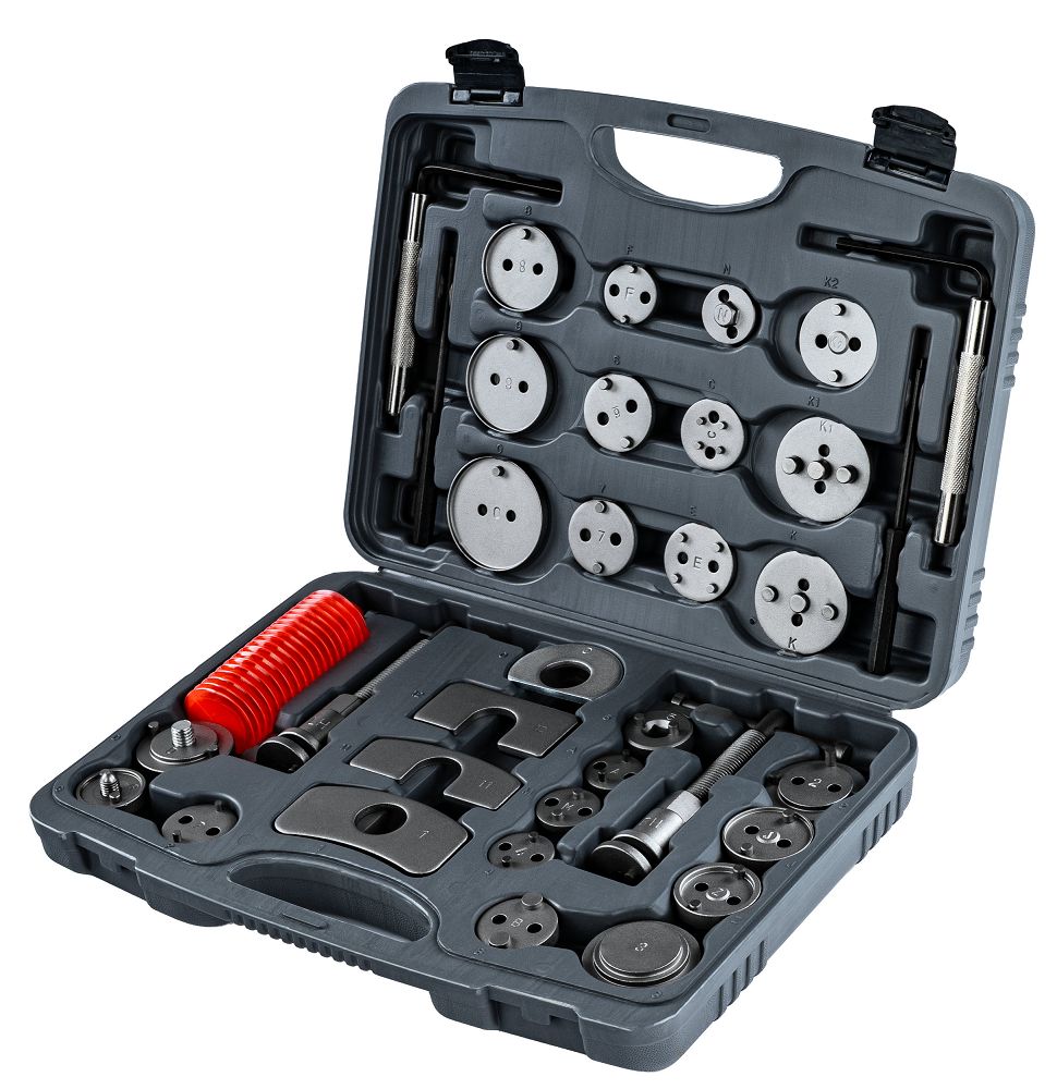 - Uniwersalność – 28 adapterów umożliwia dopasowanie narzędzia do wielu typów tłoczków hamulcowych