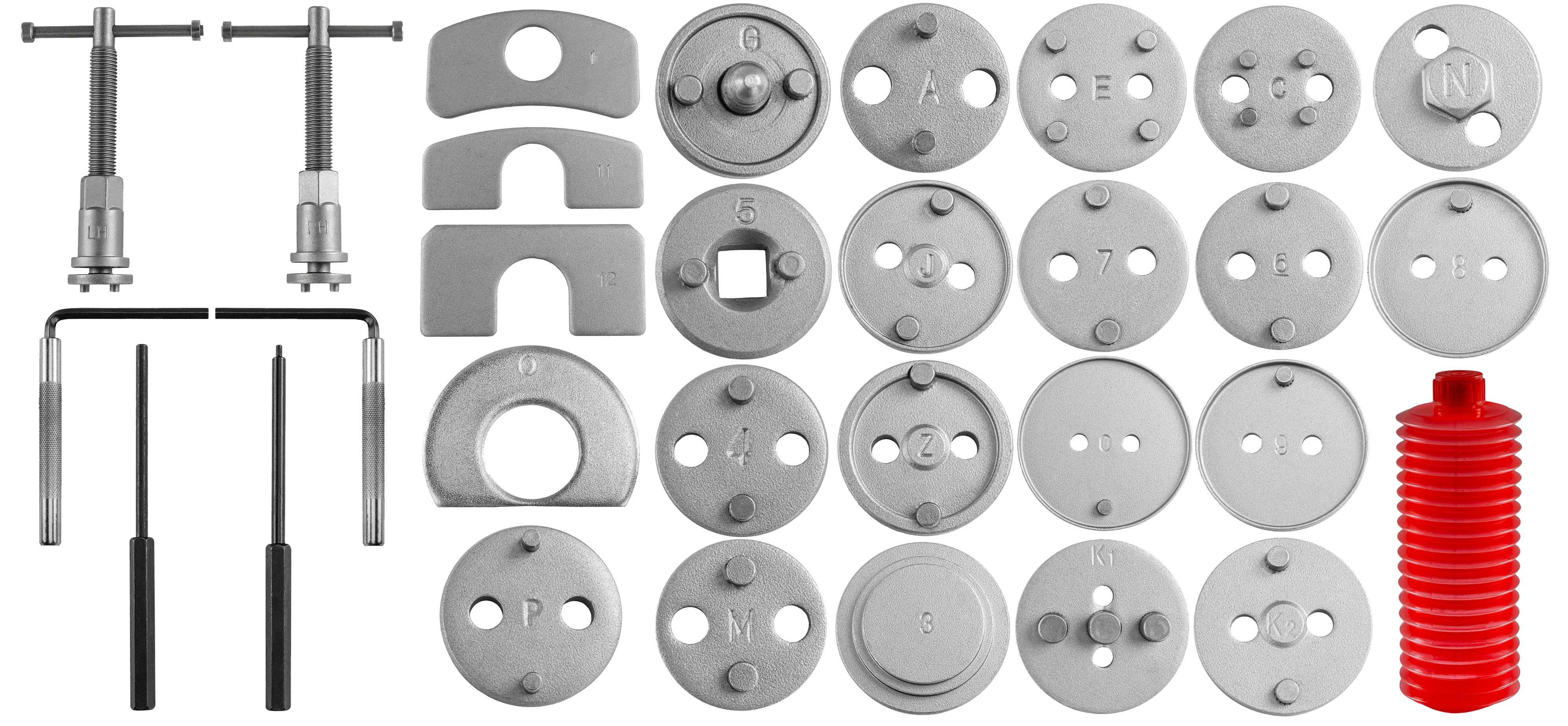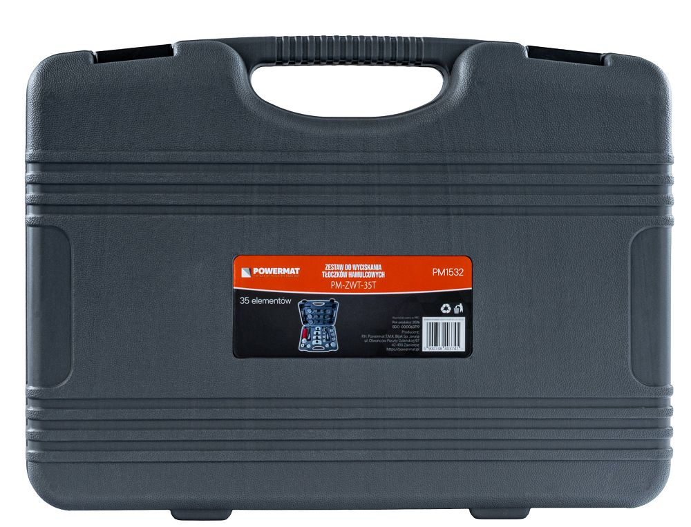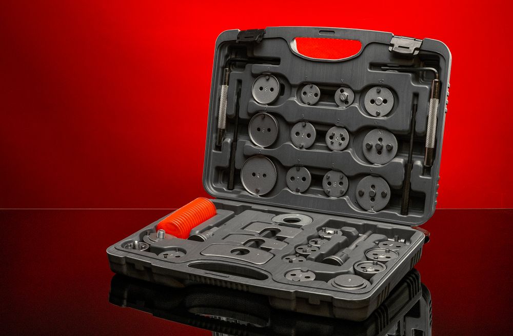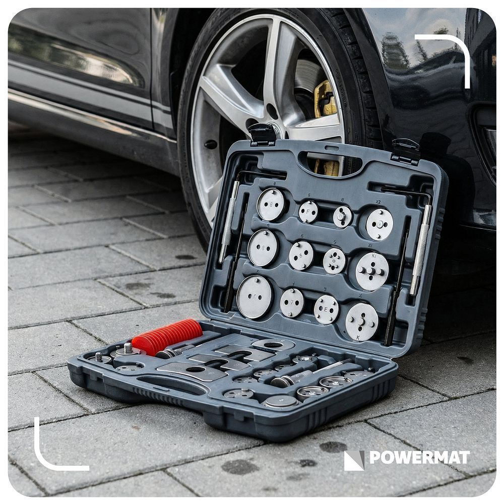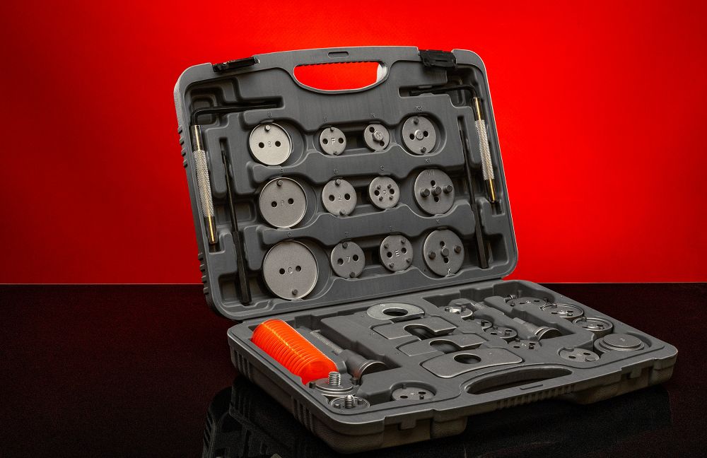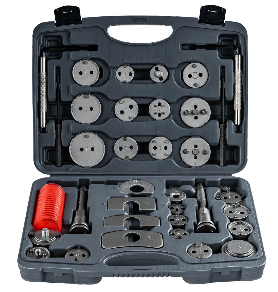 - Uniwersalność – 28 adapterów umożliwia dopasowanie narzędzia do wielu typów tłoczków hamulcowych