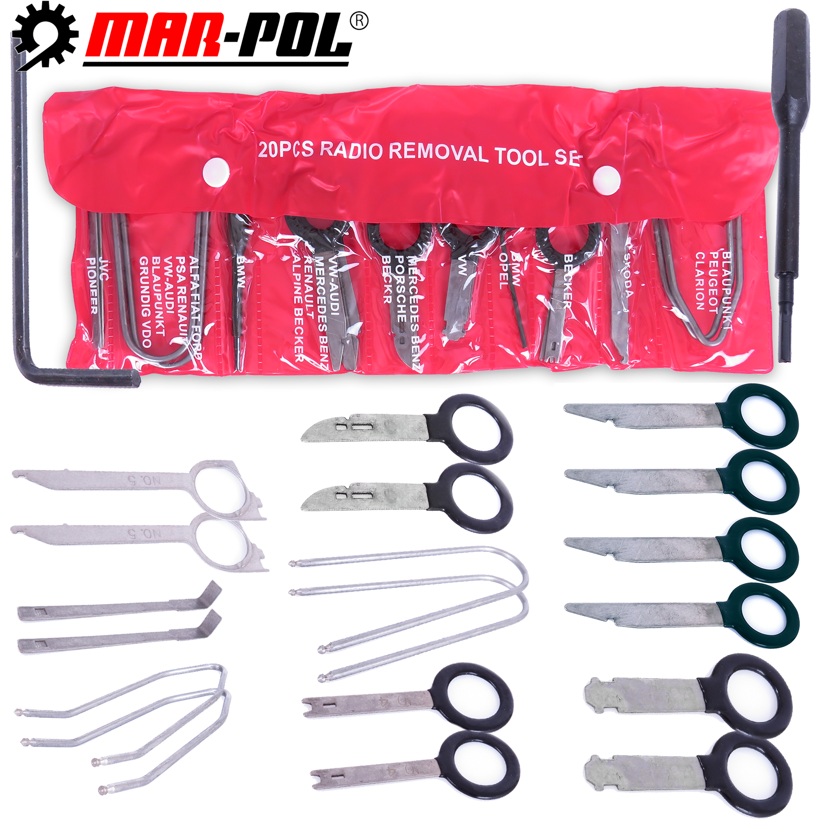 Zestaw kluczy MAR-POL kompatybilnych z wieloma najpopularniejszymi markami oraz modelami urządzeń takich jak radio/nawigacja samochodowa.