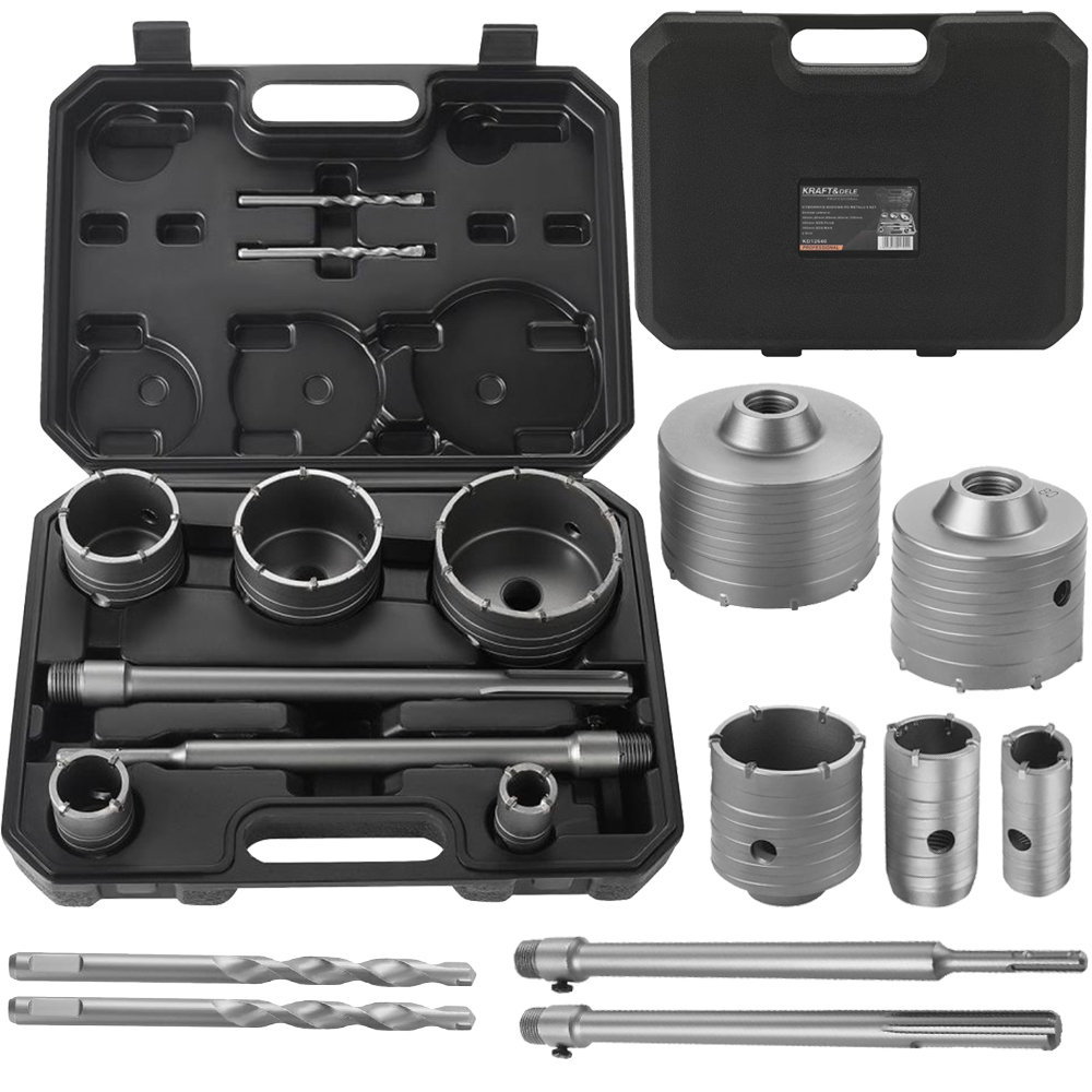 Zestaw otwornic z widią do betonu to uniwersalne rozwiązanie przeznaczone do wiercenia otworów w twardych materiałach, takich jak beton, cegła, kamień czy płyty gipsowe. Dzięki ostrzom wykonanym z węglików spiekanych HM narzędzia cechują się wysoką trwałością, skutecznością i precyzją pracy. Zestaw wyposażono w adaptery SDS PLUS i SDS MAX, co zapewnia szeroką kompatybilność z popularnymi typami wiertarek. Całość umieszczona jest w solidnej walizce, co ułatwia przechowywanie i transport.