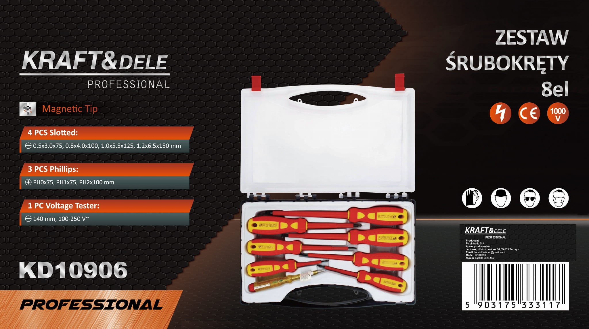 - Typ narzędzi: wkrętaki płaskie i krzyżowe, izolowane