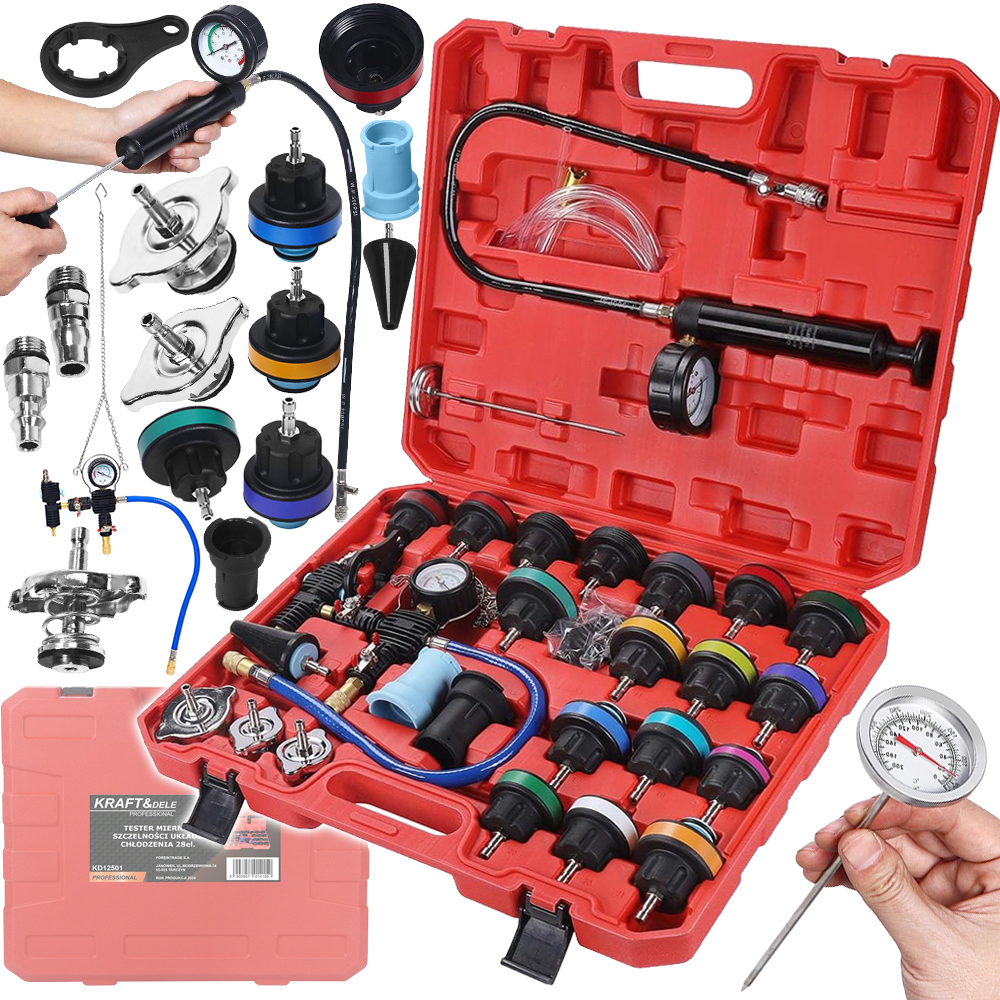 Tester szczelności układu chłodzenia to kompleksowe narzędzie diagnostyczne przeznaczone do kontroli stanu układów chłodzenia w pojazdach. Zestaw umożliwia szybkie i precyzyjne wykrywanie nieszczelności w takich elementach jak chłodnica, przewody czy korek ciśnieniowy. Dodatkowo pozwala na sprawne odpowietrzanie układu oraz wspiera proces wymiany płynu chłodniczego, co czyni go praktycznym rozwiązaniem zarówno w warsztatach, jak i podczas samodzielnej obsługi pojazdu.