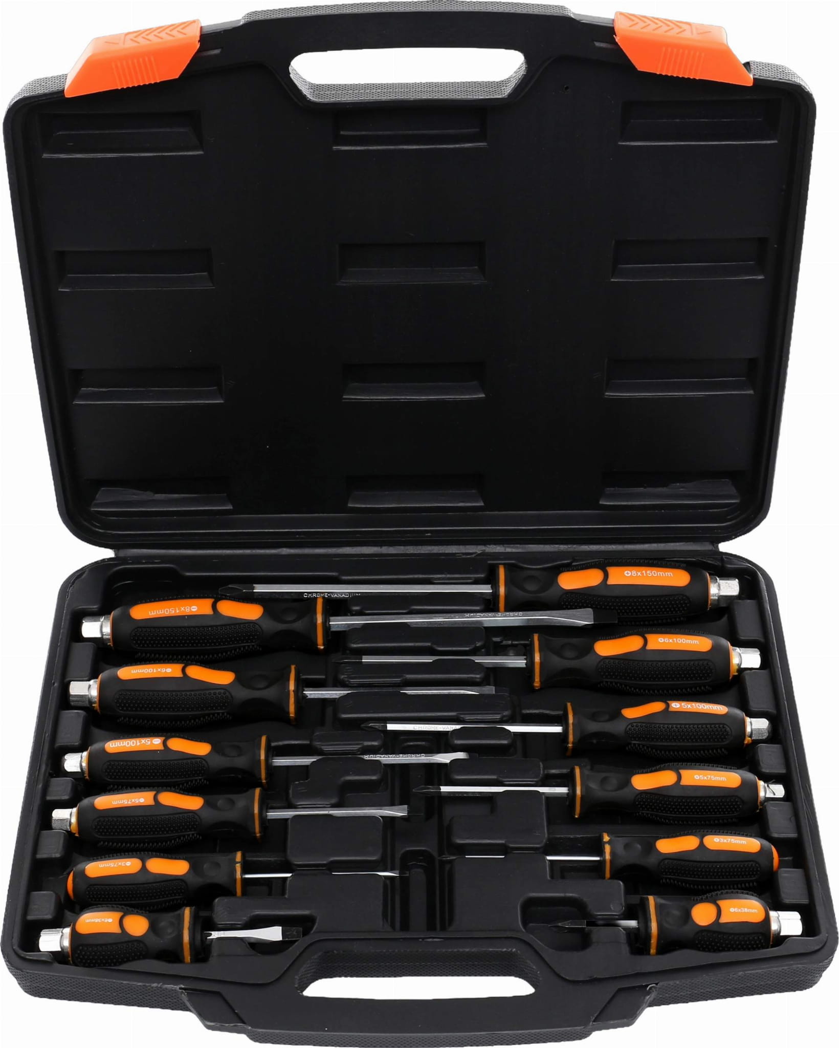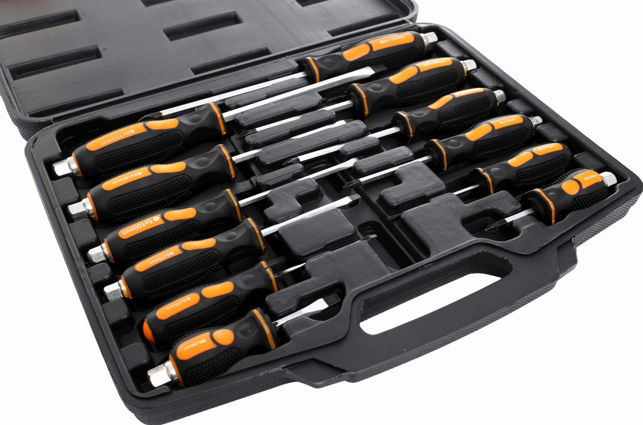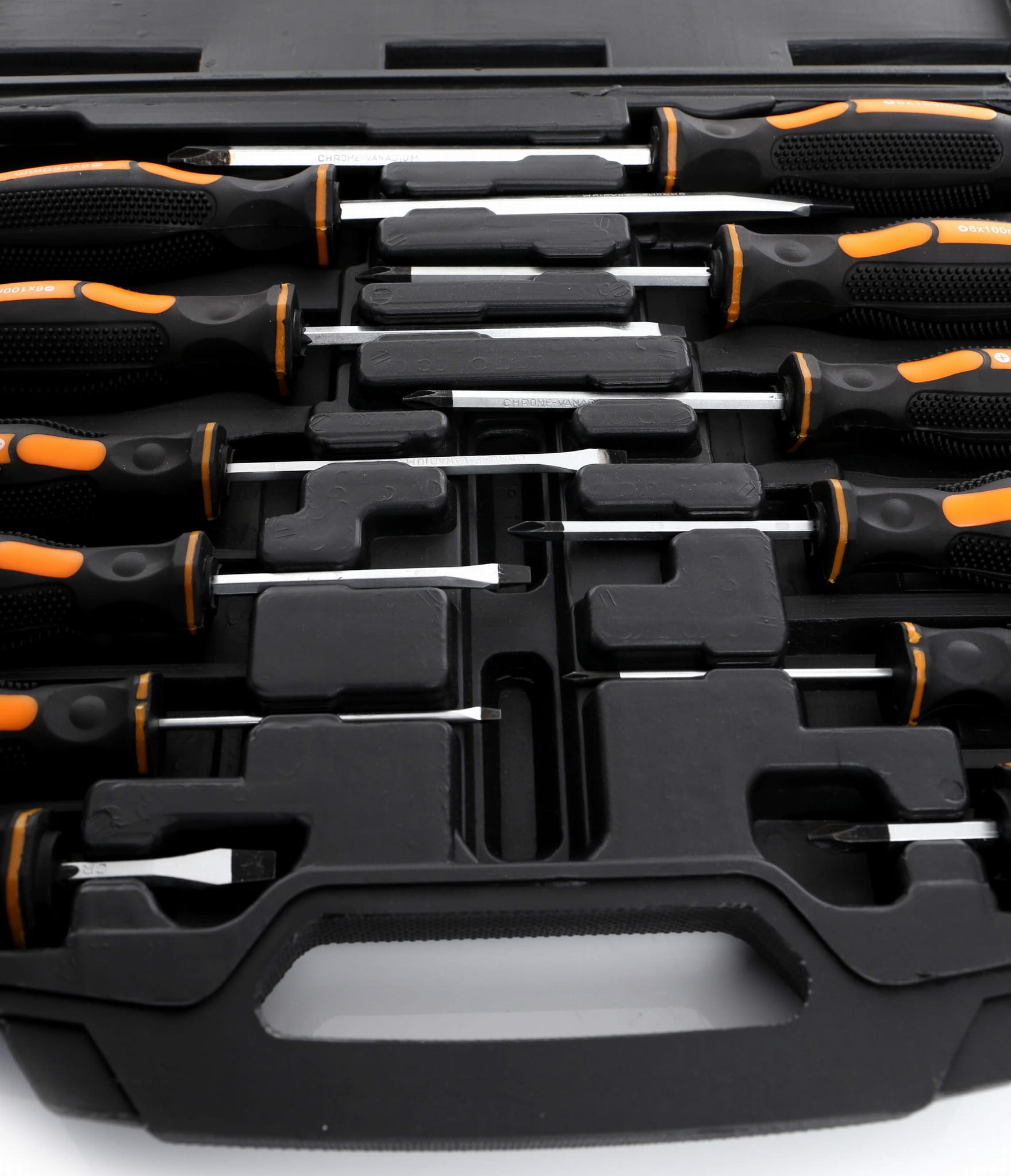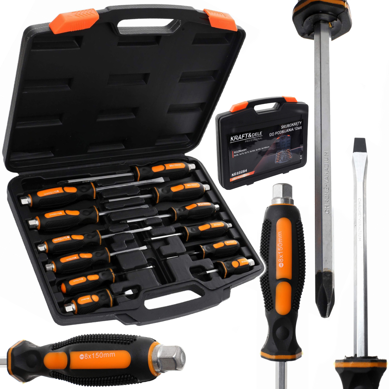 Zestaw profesjonalnych wkrętaków ślusarskich do podbijania, to kompletny pakiet narzędzi dla majsterkowiczów i fachowców. W skład zestawu wchodzi 12 wytrzymałych śrubokrętów (6 krzyżakowych i 6 płaskich), wykonanych ze stali chromowo-wanadowej (CrV) z utwardzanymi końcówkami.