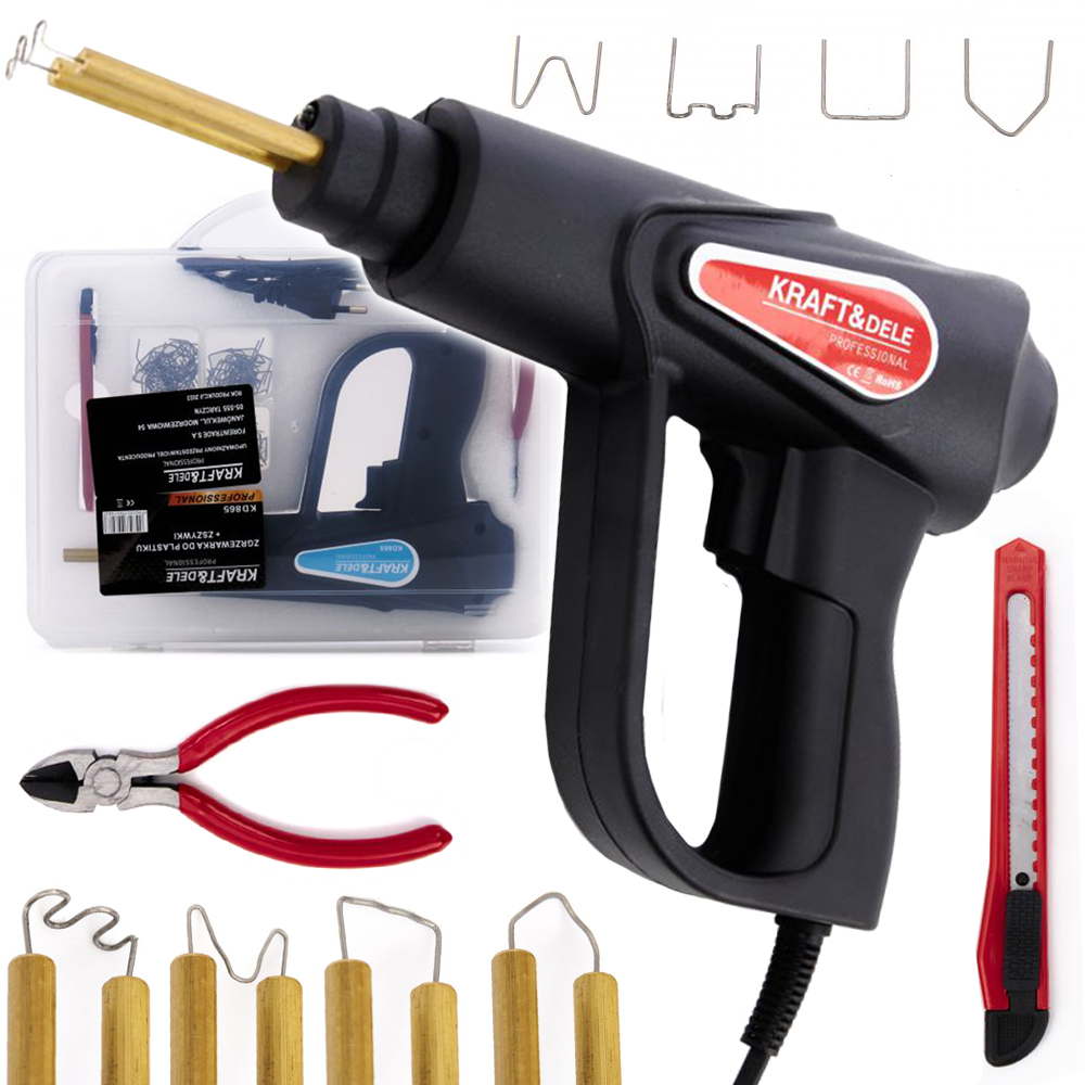 Zgrzewarka do plastiku sprzedawana jest w zestawie z podstawowymi akcesoriami, umożliwiającymi natychmiastowe rozpoczęcie pracy. W skład kompletu wchodzą również cążki oraz nóż tapicerski, niezbędne do przygotowania oraz wykończenia naprawianych elementów.